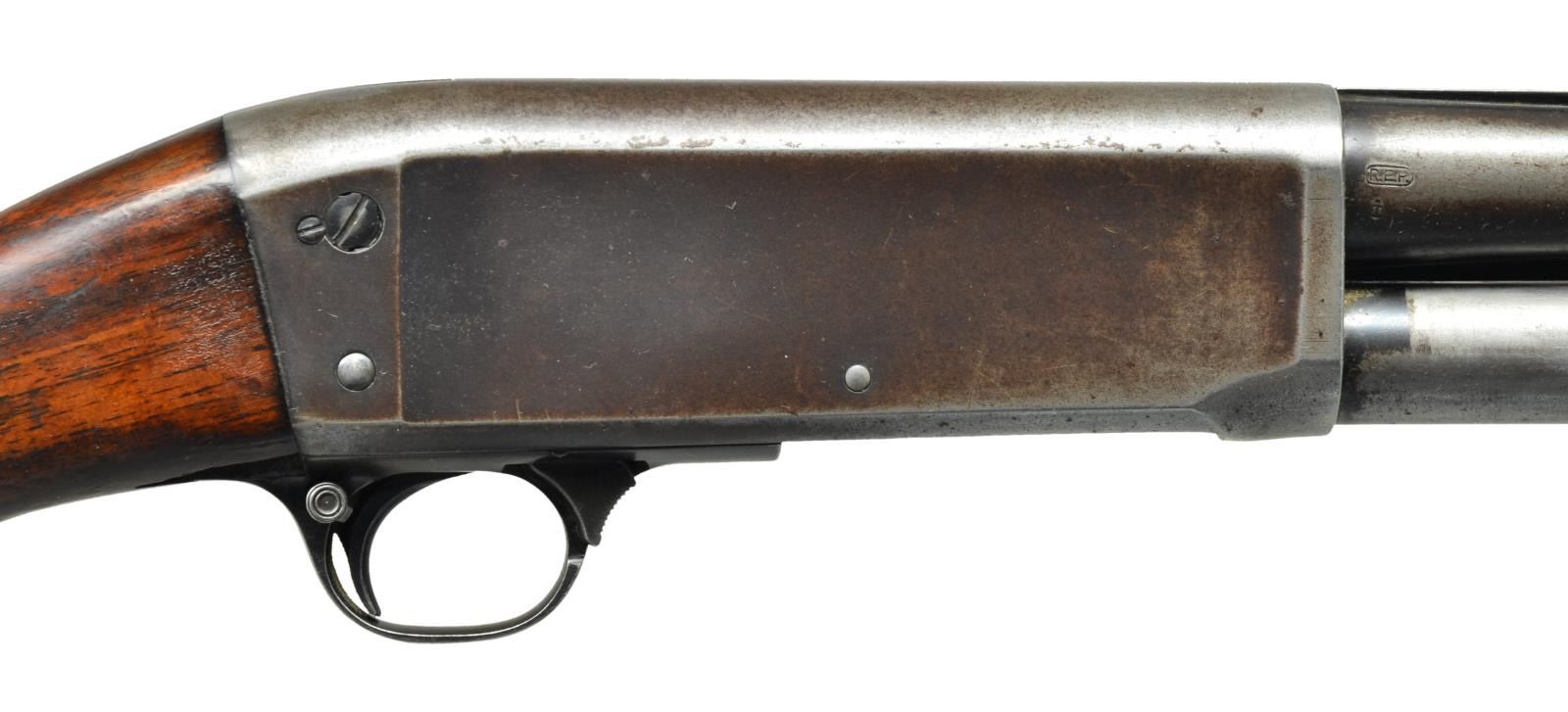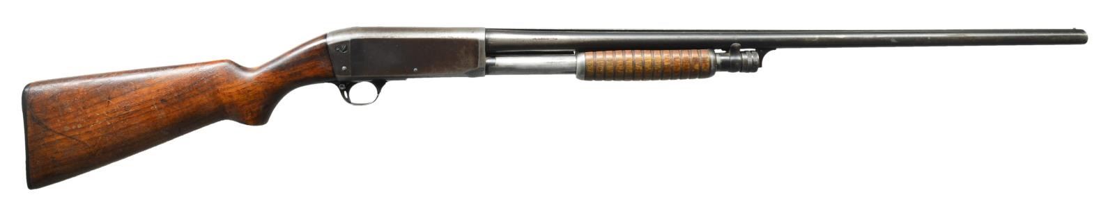 Cal. 20 Ga. S# 33859. Bbl. 28" w/ solid rib & steel bead. Fixed Imp-Mod choke. Bottom eject action w/ blue finish. Sm. rnd. grooved pump handle & pistol grip walnut stock w/ original buttplate. CONDITION: 40% dull blue fading to gray showing scattered corrosion. Forearm has worn finish w/ dents & handling marks. Added stock finish has a blistered appearance over numerous scratches, dents & handling marks. Stock is chipped right of trigger guard. Good mechanics. Bore shows dents 6 7/8" from muzzle w/ light ring in choke area. (21-4349/DS). CURIO. $250-350.