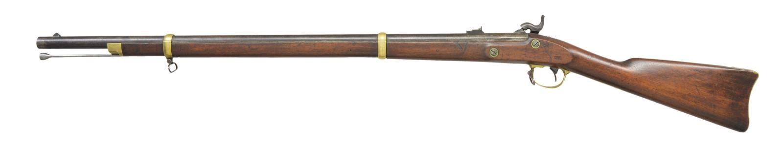 Cal. 58. NSN. Standard configuration of the popular brass mounted Civil War rifle, 33" blued barrel marked at breech "1863” & “V” / “P” & eaglehead proofs. "STEEL" at left side. 2-leaf 3-position rear sight and saber bayonet lug. Case colored lock stamped with eagle and “REMINGTON’S / ILION, NY” and “1863 at tail. Brass furniture and straight grain stock with 2 inspector cartouches. This rifle saw some use, additional “US” stamp on top of breech. CONDITION: Very good overall, complete & matching. Iron & brass patinas. Stock is solid, hand worn patina. PROVENANCE: From the Lifelong Collection of Glen E. Mattox. (01-22512/JS). $2,000-2,500.
