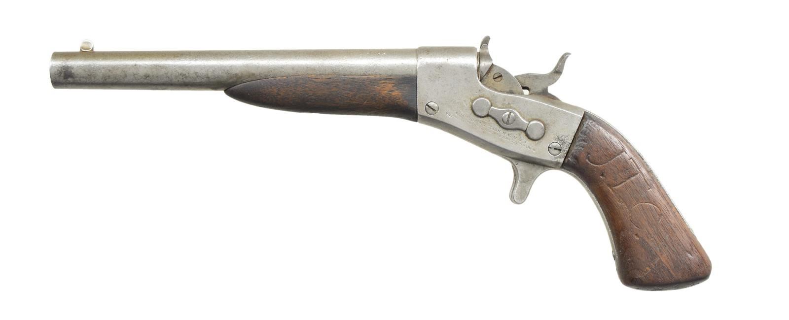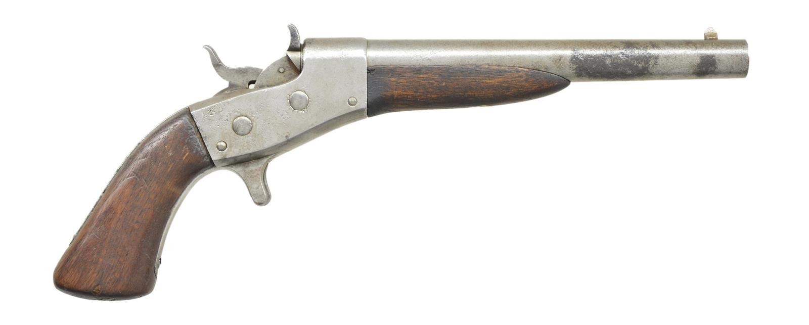 Cal. 50 RF. NSN. Bbl. 8 1/2" with pinched front sight blade. Mfg. 1866-1870; approx. 6,500 units by revised research. Earliest model with spur trigger and bottom center extractor nub. No numbers on sides of tangs, barrel or stock set; anchor over chamber. Left side of grip user carved "J.T.C.". CONDITION: poor to fair cleaned pitted appearance. Handling marks on wood plus dents on butt of grip. Poor dark bore with wear, oxidation and pitting. (01-22115/NW). ANTIQUE. $300-450.