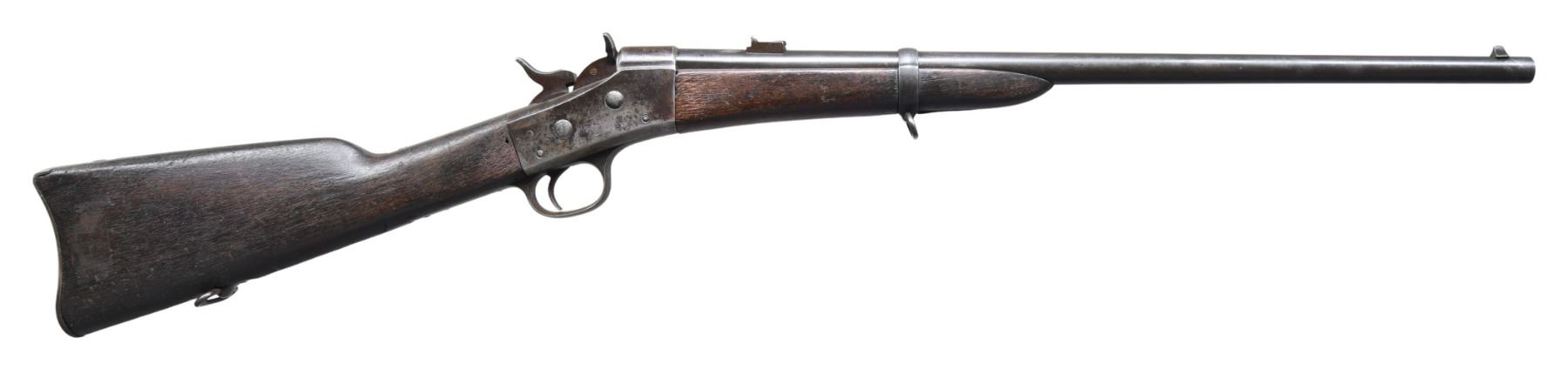 CARBINE. Cal. 50-45 CF. S# 2760. Bbl. 23 1/4" rnd. Blade front sight with folding leaf rear sight. Breech end of bbl. is marked with a naval anchor. Right side of rolling block action is stamped "P/ F.W.C." over a navy anchor. Band fastened forearm and straight grip stock with iron carbine buttplate and sling swivels. Quantity of 5,095 circa. 1868-1869. CONDITION: metal has faded brown appearance showing spots of pitting. Wood has dark worn appearance with numerous dents, scratches, and marks. Sound mechanics. Bore is generally bright with strong rifling. (01-27029/DS). ANTIQUE. $1,200-1,800.