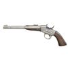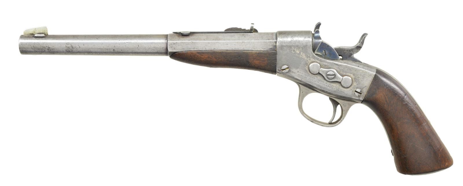 Cal. 22 RF. S# 213. Bbl. 10" part round, part octagon without markings on top or under forend. Rear sight is semi buckhorn elevator adjustable; front is brass blade in dovetailed base. Style of barrel used on 1891 Target Models that were made using Army frames. Both tangs numbered 213; forend and grip not numbered. Mfg. early to mid 1870's. Right side of frame has "P" and "F.C.W." military marks; left side Remington markings at bottom below button. Stock set is smooth without checkering. Modified centerfire firing pin altered to strike top of rim rather than normal bottom impact. Rolling block has sight notch at top. CONDITION: fair to good overall appearance with no case colors; good to very good Nitre blue on rolling block. Cleaned in the white appearance throughout with evidence of prior pitting on barrel. Numerous handling marks on stock set with cluster of dents on butt plus row of light dents on bottom of forend. Poor dark bore with wear, pitting and oxidation; rifling barely visible. (01-22302/NW). ANTIQUE. $400-600.