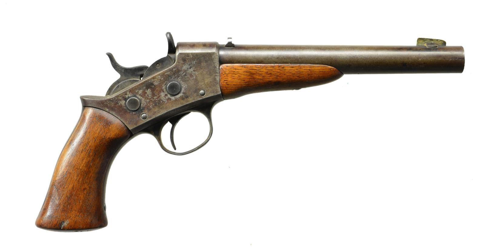 Cal. 22 RF. S# 1061. Bbl. 8" with brass blade in base for front sight and drift adjustable rear. Approx. 800 mfg. 1887-1891 using surplus 1871 Army frames. Smooth walnut stock set; forend numbered 90 and 8 in grip. Both tangs on left side have 1061. Action has side extractor. Remington marks at top of left side and on top of barrel. CONDITION: good general appearance having spotty grey patina tone. Very good blued finish under forend. Light handling marks to include cluster of dents on butt. Good condition of screw heads and mechanics. Poor to fair bore that is dark, worn and pitted. (01-22156/NW). ANTIQUE. $500-750.