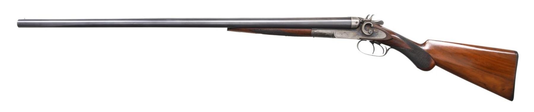 Cal. 12 ga. 2 3/4". S# 233388. Bbls. 30" of fluid steel. Steel front bead. Fixed full & full chokes. Case-colored top lever action. Double triggers. Extractors. Splinter forend & round knob pistol grip walnut stock with hand checkering. LOP: 13 3/4" over original buttplate. WEIGHT: 7 lbs, 9.4 oz. Estimated 30,000 mfg. 1885-1909. CONDITION: very nice original gun. Bbls. retain 90% of their lightly worn blue. Action has good case colors in protected areas with fading from carry wear. The lightly worn original wood finish shows scattered scratches & marks. Toeline of the stock has a plugged hole for swivel attachment. Bores are generally bright with some light pitting. (24-1034/DS). CURIO. $500-800.