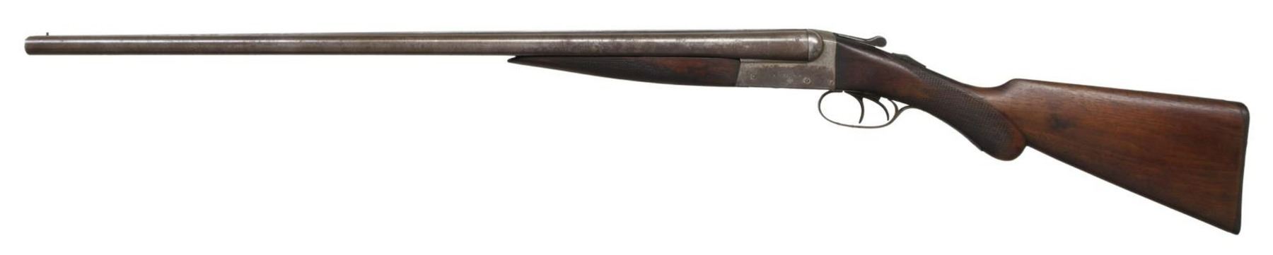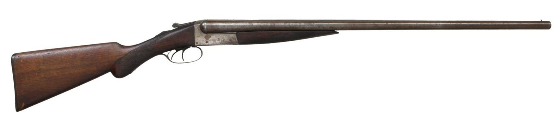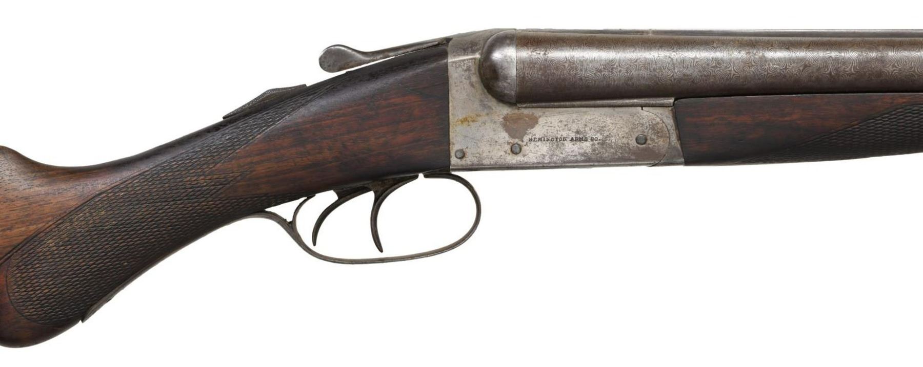 Cal. 16 GA. S# 323979. Bbl 28". Model 1894, hammerless, side-by-side shotgun, manufactured by Remington Arms Company. Damascus barrels w/ matte rib & brass bead front sight. Tang-mounted safety. Checkered wood buttstock w/ "RA" monogram, brown hard rubber buttplate, & checkered wood splinter forend. Matching numbers are present on the receiver, barrel, forend, & forend iron. CONDITION: metal components exhibit a mottled gray patina w/ scattered spots of surface oxidation & some pitting overall. Mirror bores. Wood furniture shows some scattered marks & impressions from handling & storage, but otherwise remain sturdy & serviceable. (23-2509/MLW). CURIO. $300-450.