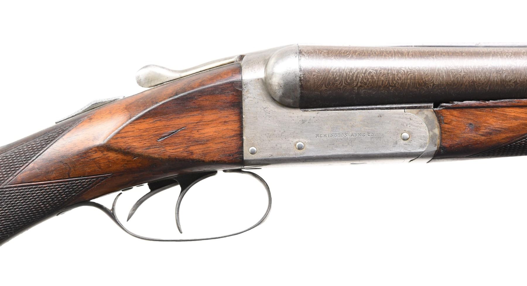 Cal. 12 ga. S# 115479. Bbls. 30" of Damascus steel w/ steel front bead. Case colored boxlock action is marked "REMINGTON ARMS CO." on both sides. Double triggers. Selective ejectors. Splinter forearm & round knob walnut stock have point pattern hand checkering. LOP: 13 7/8" over original buttplate. DAC: 1 7/8". DAH: 3". Neutral cast. Bore diameter: R .725 L .725. Choke constriction: R .034 L .034. Wall thickness: R .029 L .033. WEIGHT: 7 lbs, 7 oz. Mfg. 1899. CONDITION: bbls. retain 80% browned finish showing vivid Damascus pattern. Action has faded to gray showing scattered spots of corrosion. Wood has worn finish showing scratches, marks & dents. Forearm has small chips along both bbl. channels w/ hairline cracks extending from the iron. Top lever sits slightly left of center. Good bright bores. (24-3934/DS). CURIO. $400-600.