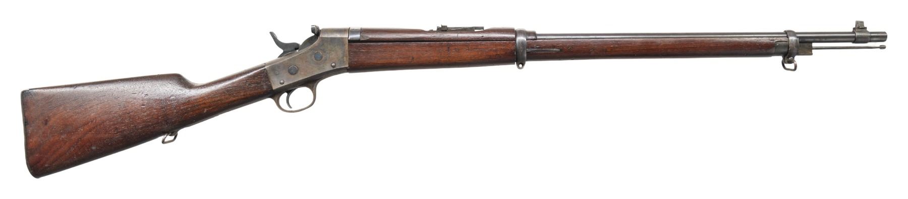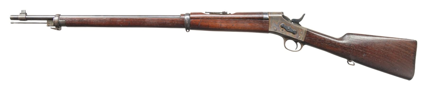 MILITARY RIFLE. Cal. 7mm Mauser. NSN. Bbl. 29 1/2". Barrel is marked on top "CAL. 7M.M.". Receiver tang is marked "REMINGTON ARMS CO. / ILION, N.Y. U.S.A. / PAT'D. OCT, 22ND, 1901". Rifle is equipped with low ramp ladder rear sight graduated to 1,900 yards. Inverted "V" front sight mounted on the 1910 style barrel band. Rifle is equipped with Days' patent extractor. Cleaning rod is present. Swivel bow and screw are not present in the lower band. Walnut stock set. Buttstock equipped with the later tang type buttplate. Buttstock is marked with tiny "HM" acceptance mark behind lower tang. Forend secured by two barrel bands. Handguard has the blued sheet metal reinforcing band in-front of the receiver. CONDITION: stock set has worn original finish with numerous scattered handling marks. Metal retains 60% of its original blue except the receiver which shows 60% of its original case colors with spots of oxidation and very fine pitting. Bore has worn lands and lightly frosted grooves. PROVENANCE: Estate of Groves Herrick. (25-5673/RW). CURIO. $500-800.