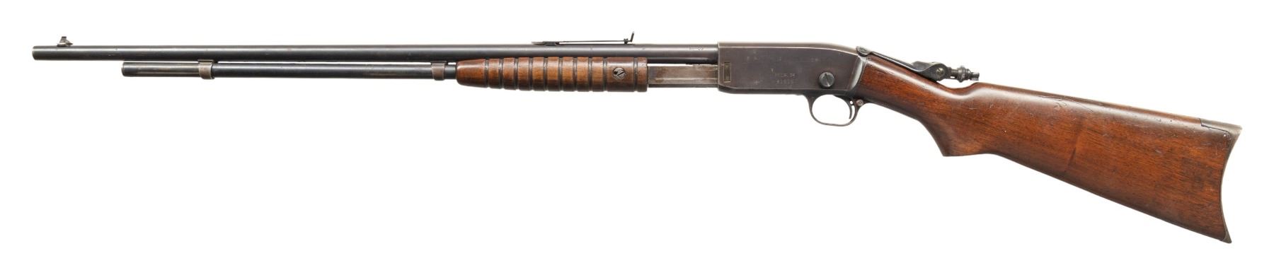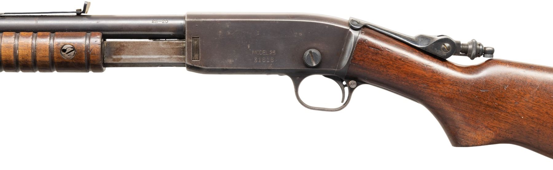 Cal. 25-20. S# 31616. Bbl. 24". Model 25 slide action rifle mfg. by Remington. Top of the bbl. is marked with Remington's 2-line mfg. and patent information, with the cal. designation and "OE" date code marked on the left towards the breech. Left side of the receiver is marked "MODEL 25" above the S#. Metal components exhibit a blue finish overall, save for on the bolt assembly, which is polished in-the-white. Grooved wood pump and plain wood pistol grip buttstock with crescent steel Remington UMC buttplate. Wood furniture appears to have been lightly sanded and refinished. Dovetailed blade front sight (bead absent) with unmarked dovetailed rear sight, and reblued Parker Hale flip-up aperture tang sight. CONDITION: metal components retain large amounts to the majority of their original factory blue finish, exhibiting areas of wear and thinning that are fading to gray patina, as well as scattered spots of light to mild surface oxidation and pitting overall. Bright bore, exhibiting scattered spots of light pitting, while retaining strong rifling throughout. Proper manual mechanics. Wood furniture shows scattered marks and impressions from handling and storage, with the buttstock exhibiting a crack on the right side of the wrist, stemming from the receiver. PROVENANCE: Estate of Groves Herrick. (25-5708/MLW). CURIO. $300-500.