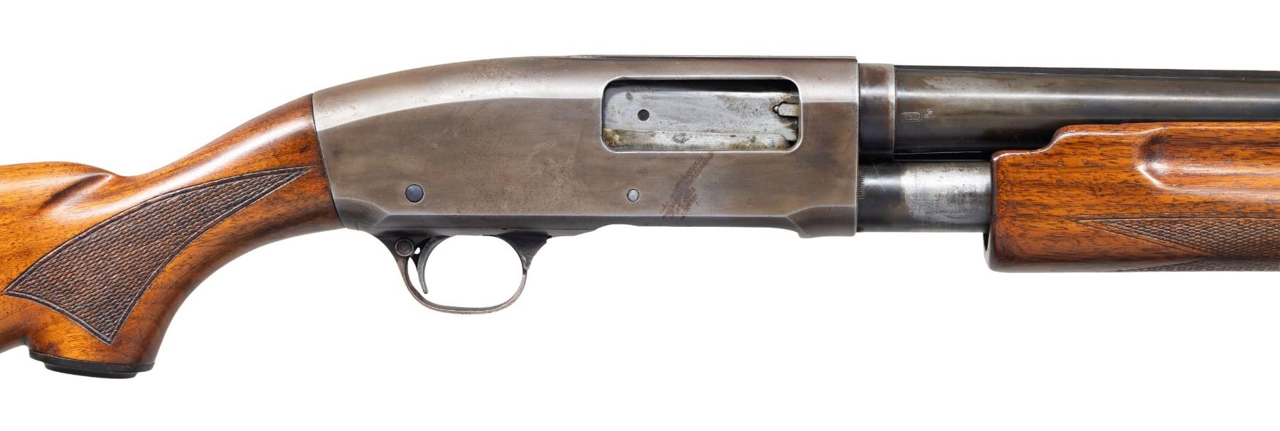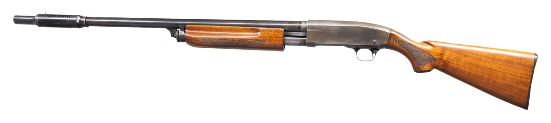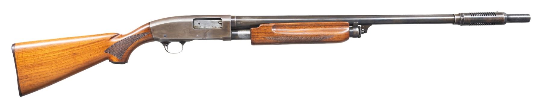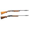 1) MODEL 31 PUMP ACTION. Cal. 12ga. S# 32531. Bbl. 22 1/8". Model 31 pump action shotgun mfg. by Remington. Left side of the bbl. is marked with Remington's mfg. and patent information above "12 GA." and "MOD". Left side of the receiver is marked with the Remington trademark logo above "MODEL 31" and the S#. Metal components exhibit a blue finish overall, save for on the bolt, which is polished in-the-white. Lightly sanded and refinished checkered wood pump and brown synthetic capped pistol grip buttstock with grooved brown synthetic Remington buttplate. Pistol grip cap screw is an improper replacement. Solid matte rib terminates in a Lyman Cutts compensator with an aluminum bead front sight and Modified choke. CONDITION: metal components retain fair amounts of their original blue finish, with the receiver and trigger housing having largely faded to a mellow gray patina with spots/areas of light pitting. Bbl. and Cutts compensator retain fair to good blue, showing areas of wear and thinning that are fading to gray and brown patinas. Bright bore, exhibiting some spots of light to mild pitting, with some fouling present at the breech area. Proper manual mechanics. Wood furniture shows scattered marks and small impressions from handling and storage, with the buttstock exhibiting a crack on the right side of the wrist, and 2 cracks on the underside of the wrist, all stemming from the receiver. (25-4452/MLW). 2) SPORTSMAN 48 SEMI-AUTOMATIC. Cal. 20 GA, 2 3/4". S# 3817615. Bbl. 25 1/2". Sportsman 48 semi-automatic shotgun mfg. by Remington. Left side of the bbl. is marked with the cal. designation followed by "IMP. CYL.", with Remington's mfg. and patent information marked on the right. Left side of the receiver is marked with the model designation and S#. Metal components exhibit an aftermarket applied parkerized finish overall, save for on the alloy trigger housing which exhibits a black anodized finish. Checkered wood forearm and pistol grip stock with black synthetic and rubber recoil pad. Bbl. terminates in a Lyman Cutts compensator with an integral aluminum bead front sight. CONDITION: metal components retain the vast majority of their reapplied parkerized finish, showing some spots of light pitting beneath the finish. Mirror bore. Proper manual mechanics. Wood furniture shows general finish wear, as well as scattered marks, scratches, and impressions, with the forearm exhibiting a 2 1/2" crack on the left side that stems from the receiver. (25-4498/MLW). ALL CURIO. $600-950.