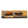 Cal. 12 Ga., 20 Ga., 28 Ga., and 410. S# OU10388. Bbls. all 28" monobloc have Remington markings on top bbls. and are marked SKEET and are serial numbered “46674”. Bottom bbl. of 12 ga. set is ported. Blued action is decorated with dogs on sides and has Remington 3200 info on bottom and is fitted with single selective trigger and toggling safety and trigger selector lever on top tang. Pistol grip buttstock of nicely crotch figured American walnut is fitted with adjustable comb and “Kick-eez” recoil absorbing system. Side panels are checkered and ribbons are through point pattern checkering at grip. Forend is numbered “449” and has usual sliding release. MEASUREMENTS: LOP: 14 3/8". WEIGHT WITH 12 GA. BBLS: 9 lb. 6 oz. UNATTACHED ACCESSORIES: gun and 4 extra bbl. sets are housed in vinyl case is lined in orange cloth. CONDITION: fine. All bbl. sets retaining nearly all of their original blue. Blue of action shows some scratches and some high edge wear. Stocks retain most of their original varnish. All bores are bright and shiny. Mechanically fine, except forend iron is bent, making it difficult to assemble. Not an uncommon problem with 3200s. (22-3750/MGM). MODERN. $2,500-3,500.