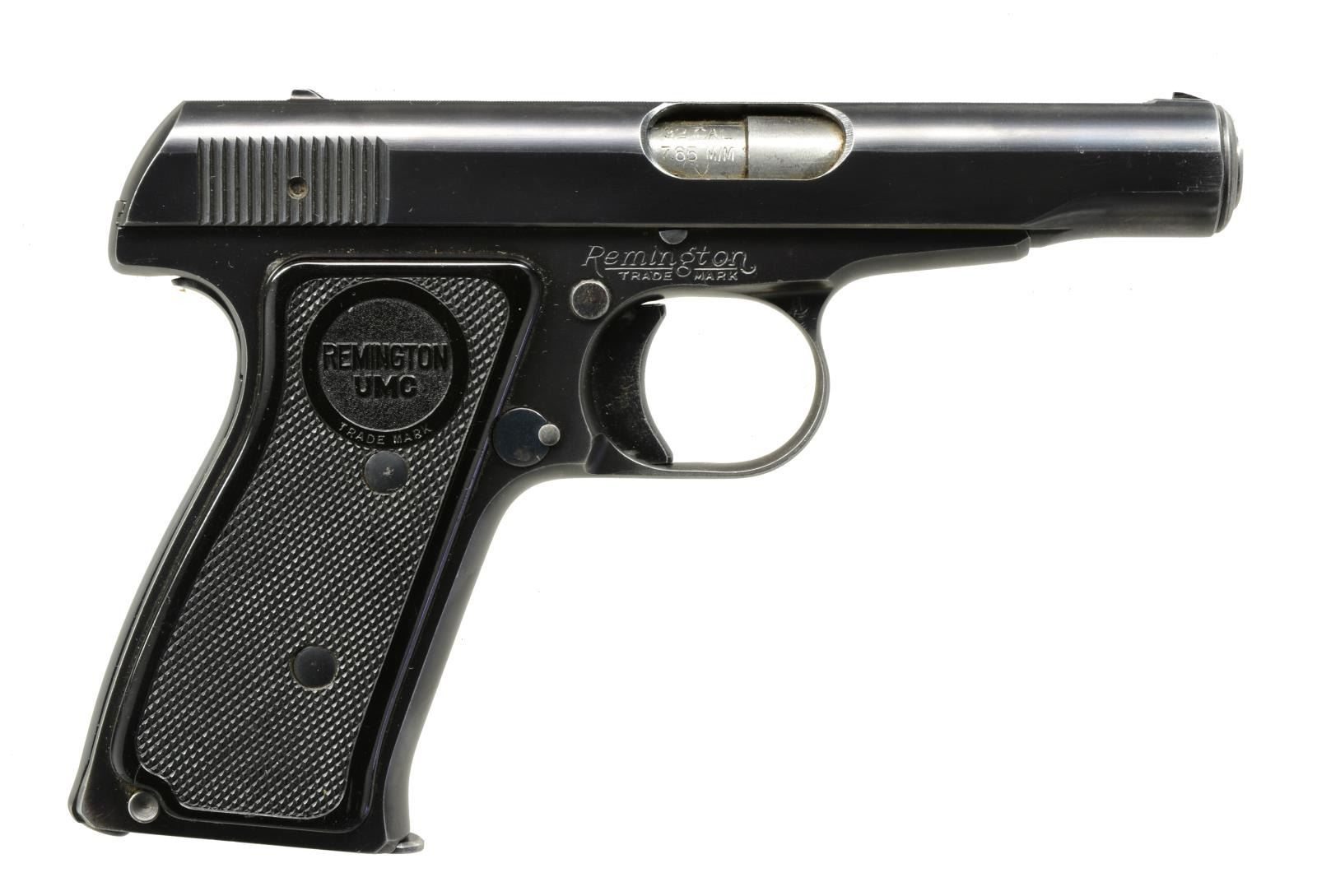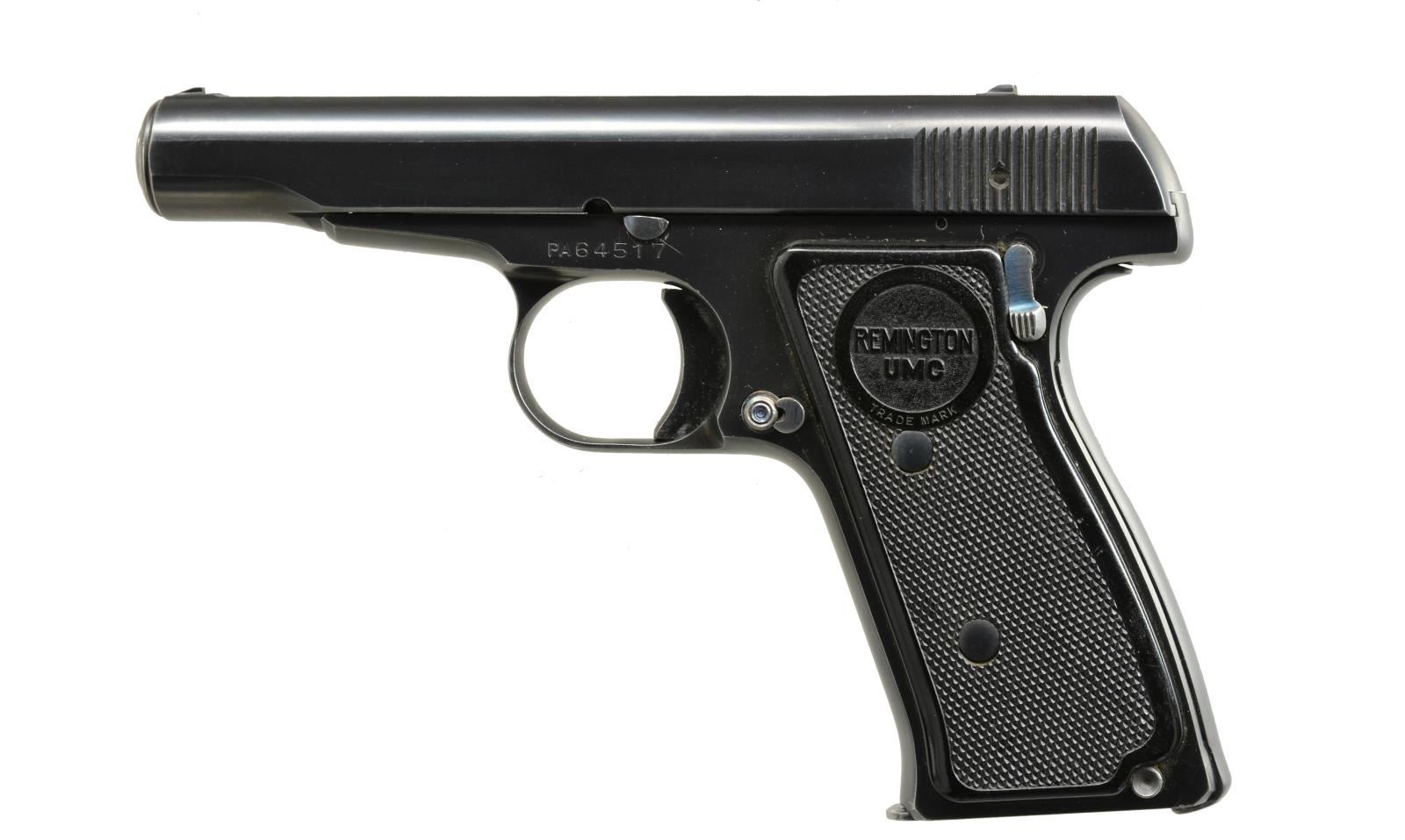 Cal. 32 ACP. S# PA64517. Bbl. 3 1/2". Mfg. 1918-1926; approx. 65,000 units (also offered in 380 ACP). Checkered Remington black synthetic grips. Thumb, grip & mag. safeties. MAGS: 1 very good 7 rd. CONDITION: slight thinning on underside of trigger guard & very faint thinning at high points. Overall very good to near excellent. Very good plus grips w/ slight hand wear. Good to very good bore w/ slight even frosting. (20-2174/NW). CURIO. $450-600.