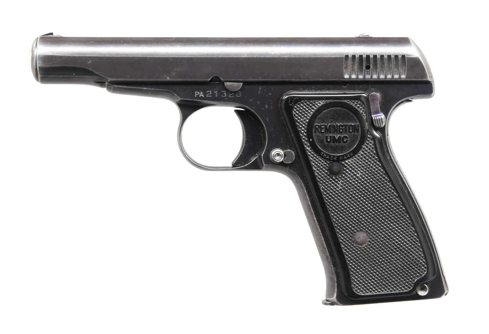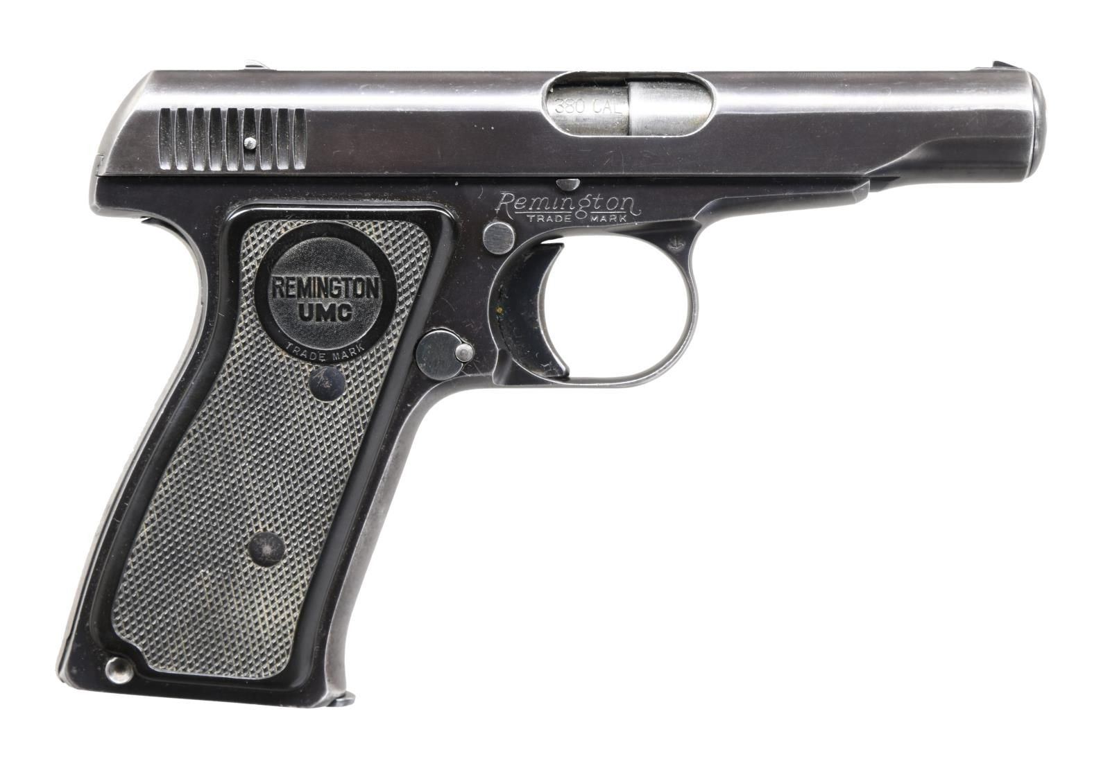 Cal. 380 ACP. S# PA21320. Bbl. 3 1/2". Short blade front sight. Low profile square notch rear sight. Pistol has a mix of Type I & II features w/ Remington trademark on right side of frame, cal. marking on bbl. & 9 slide serrations. Blue finish. Checkered black grips w/ Remington UMC logo. MAGS: 1-7 rd. CONDITION: grips show scattered dirt staining, light dings & handling marks. Metal retains 60% original blue w/ edge wear, scattered fading to gray most notably on the straps & oxidation. Bore is dirty w/ grease & oxidation but may clean up better. (23-5188/MJC). CURIO. $300-450.