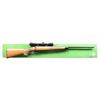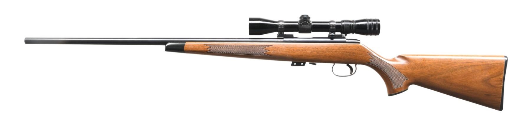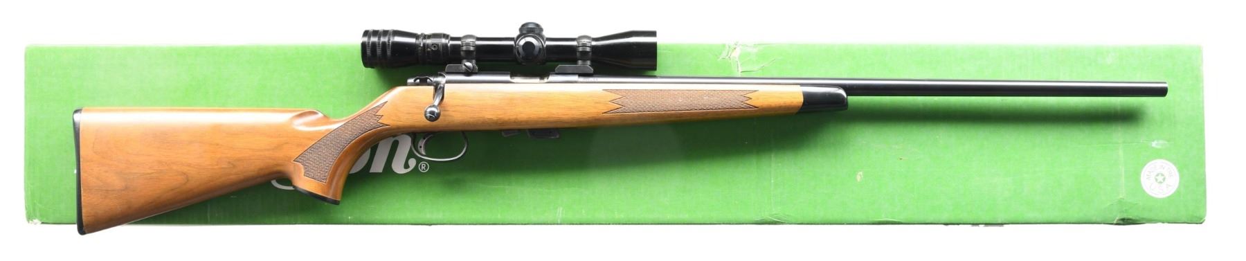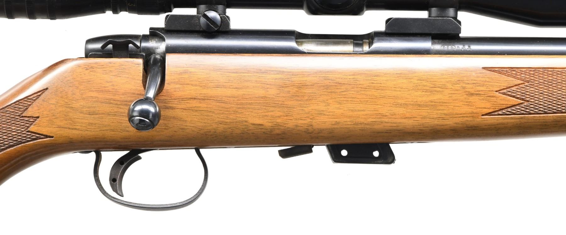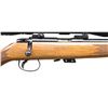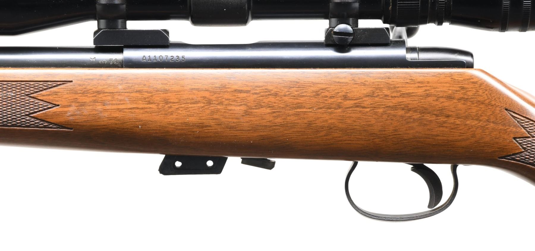Cal. 22 S, L, LR. S# A1107235. Bbl. 24" w/o sights. Redfield 5 star 2-7x32 gloss finished scope w/ duplex reticle on 2 piece mounts. Trigger has added wide shoe. Straight comb walnut stock w/ cut checkering having black forearm tip & grip cap w/ original buttplate. MAGS: 1 detachable 5 rd. UNATTACHED ACCESSORIES: original box w/ instruction packet. CONDITION: over 97% blue w/ a rifled rack wear spot on bbl. Stock shows small marks w/ a rifle rack wear spot at wrist. Very good bright bore. Scope has clear optics. (24-4251/DS). MODERN. $800-1,100.