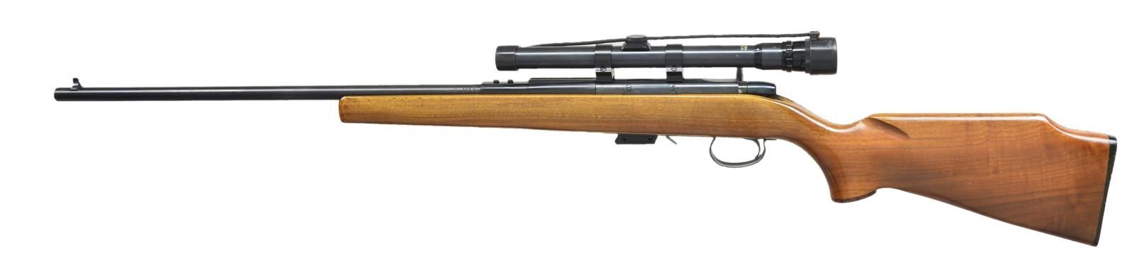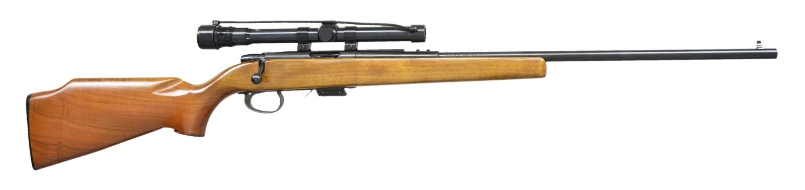 Cal.5mm Rem. Mag. S# 1021815. Bbl. 24". Mfg. 1970-1974. Blued finish on exposed metal surfaces. Blade front sight. No rear sight. Slotted receiver currently sporting 3x6 Weaver V-22A scope w/ duplex reticle. Plain hardwood stock w/ red grip cap engraved "Remington 5mm Magnum". Black checkered plastic butt plate. MAGS: 1 factory 4 rd. CONDITION: Blued finish is complete & consistent. Wood stock illustrates only a few very light impressions. Trigger mechanism doesn't appear to be functioning correctly & will need a gunsmith's attention prior to use. Bright bore w/ strong rifling. PROVENANCE STATEMENT: Estate collection of Thomas F. Wolfinger. (22-6105/JZ). MODERN. $200-400.