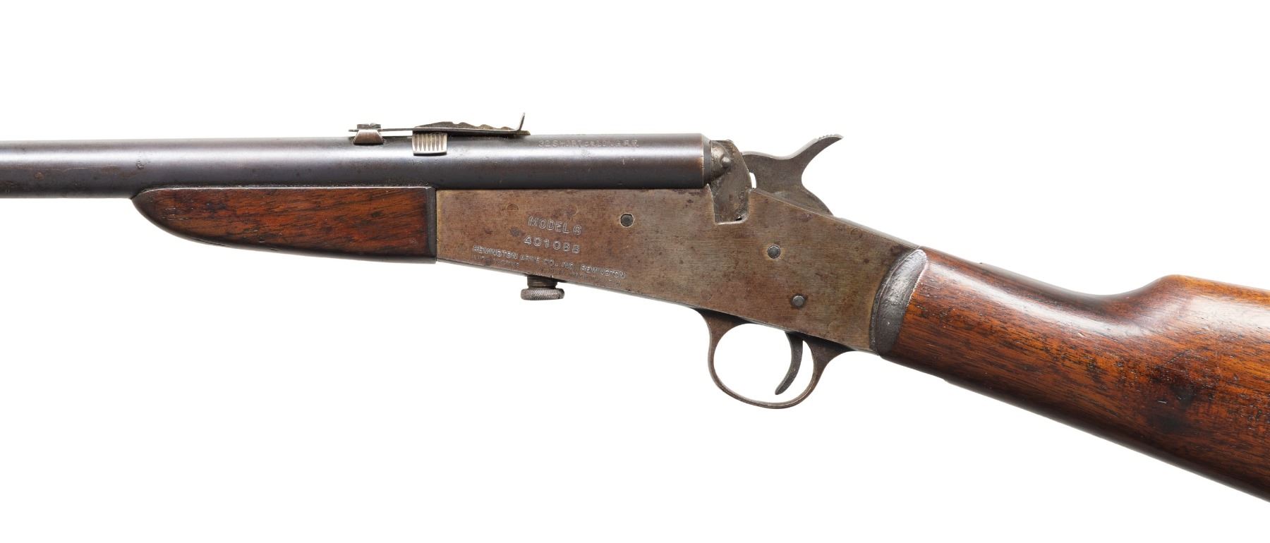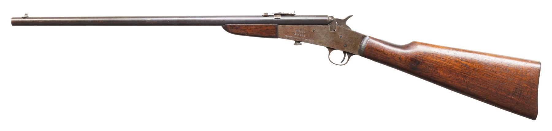 Cal. 32 S or LRF. S# 401088. Bbl. 20 1/8". Model 6 single shot breechloading rifle mfg. by Remington. Top of the bbl. is marked with the Remington trademark logo above the cal. designation. Left side of the receiver is marked "MODEL 6" above the S# and Remington's mfg. information. Bbl. exhibits a blue finish overall. Small plain wood forearm and straight grip stock with Remington UMC logo flat steel buttplate. Dovetailed aluminum beaded blade front sight with V-notch rear sight. CONDITION: receiver has faded to a mottled gray patina, exhibiting scattered spots of light surface oxidation overall. Bbl. retains large amounts of its original blue finish, exhibiting scattered spots of light oxidation, as well as some patches of moderate pitting. Bore is relatively bright, exhibiting consistent light to mild pitting, while retaining good rifling throughout. Proper manual mechanics. Wood furniture shows scattered marks and small impressions from handling and storage, with the buttstock exhibiting a 1 5/8" crack along the top of the wrist. PROVENANCE: Estate of Groves Herrick. (25-5766/MLW). CURIO. $300-400.