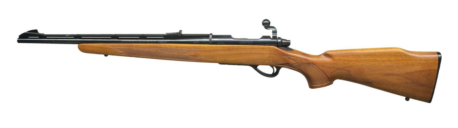 Cal. 223 Rem. S# 82521. Bbl. 18 1/2" VR w/ factory sights on quality replacement aluminum rib rather than standard (often distorted) plastic rib. Bbl. codes March 1975 & has been rechambered from 222 Rem having 3rd digit over stamped plus "223 CAL" electro engraved on right rear of bbl. Factory drilled & tapped for scope base. Trigger guard/floorplate is black anodized aluminum rather than (often distorted) factory plastic. Factory Monte Carlo walnut stock w/ pressed checkering, satin refinish, standard plastic buttplate & QD sling studs. CONDITION: faint witness marks from prior rib bases & prior scope mt.; no plug screws. Light spotty finish thinning on left side of bbl. forward of forend. Nicely refinished stock w/ satin appearance having occasional very faint handling marks. Evidence of glass bedding at front of receiver & rear tapered portion of bbl. Enlarged bbl. channel for full float, yet left half has age warped to touch bbl. leaving double wide gap on right. Overall very good to excellent appearance w/ near excellent bore. Very desirable replacement rib & trigger guard assembly. (21-4423/NW). MODERN. $450-600.