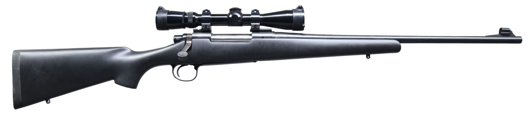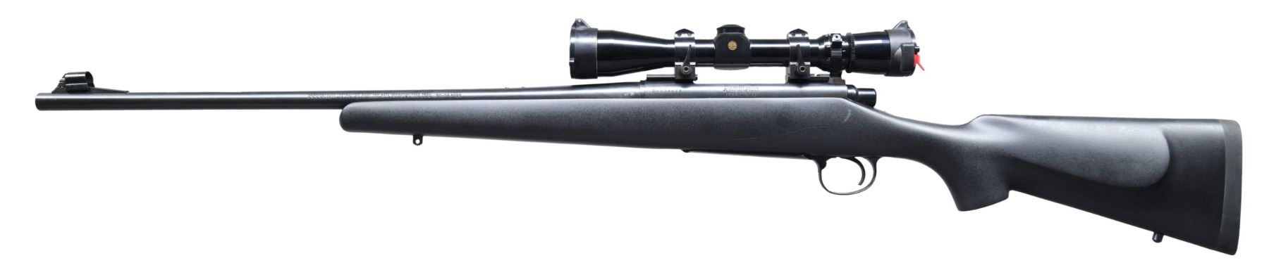 Cal. 30-06. S# D6834829. Bbl. 22". Model 700 mfg. by Remington. Receiver and bbl. show standard factory markings. Receiver, bbl., bolt handle, and bolt shroud exhibit a blue finish, with the bolt body being polished in-the-white. Aluminum trigger guard and floorplate exhibit a polished black enamel type finish. 1-piece textured Brown Precision pistol grip stock with cheek piece and Brown Precision black rubber recoil pad. Hooded and ramped blade front sight. Rear sight is absent, with screw remaining in plug holes. Receiver is fitted with a Leupold VARI-X III 2.5-8x scope mounted on 2-piece QD rings. Bolt matches the receiver via "829". CONDITION: metal components retain the vast majority of their original factory finishes, showing some minor superficial handling marks overall. Mirror bore, retaining well defined rifling throughout. Stock shows some scattered superficial handling marks and a few scratches. Scope retains a clear and sharp optic. (25-3603/MLW). MODERN. $500-800.