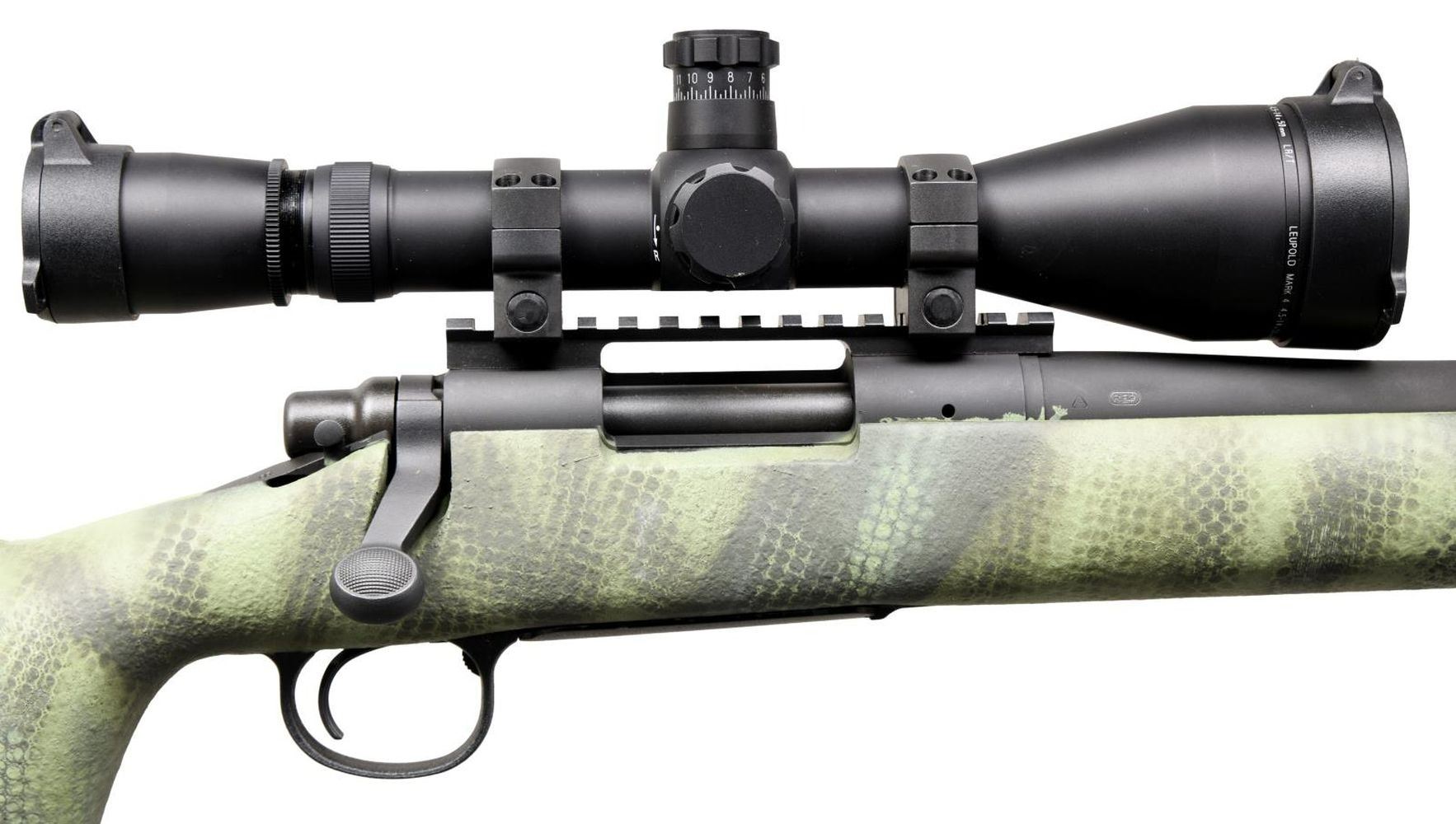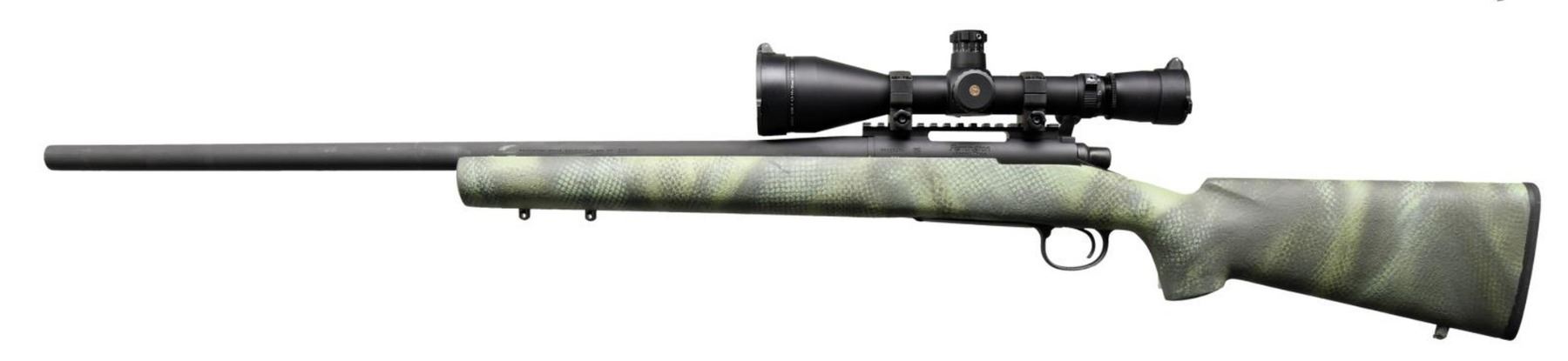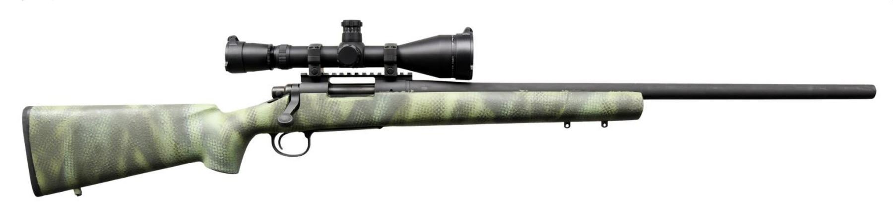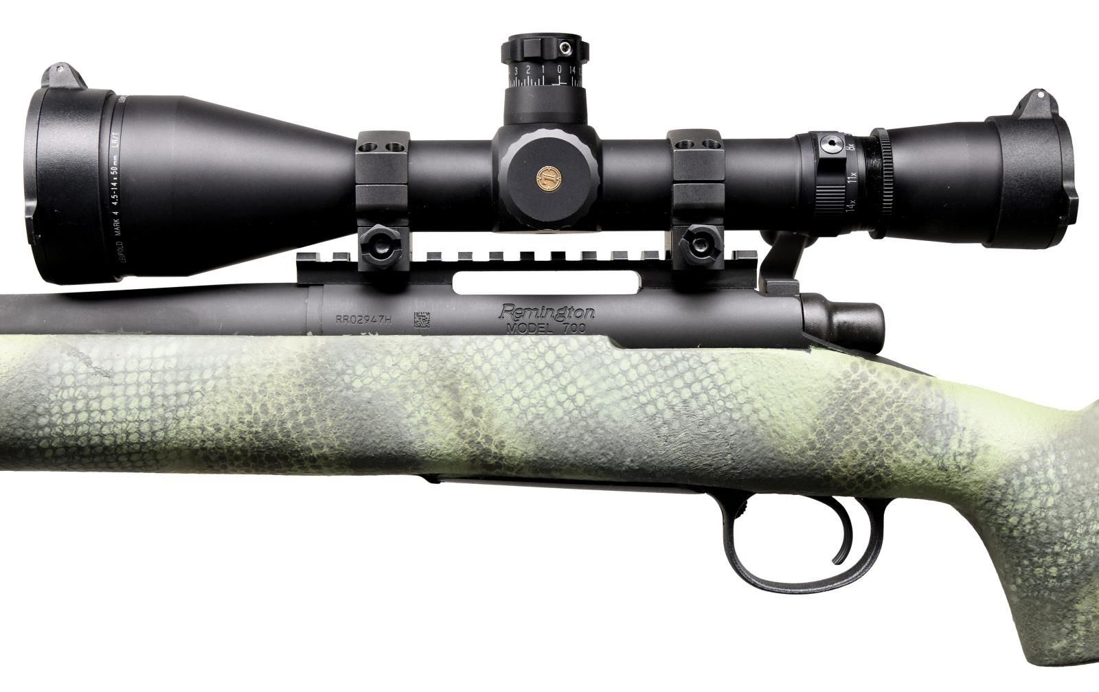Cal. .308 Win. S# RR02947H. Bbl 26". Model 700 manufactured by Remington. The left side of the barrel is stamped with Remington's single line address, followed by the caliber designation. Left side of receiver is stamped with the serial number and model designation. Matte gray cerakoted finish, with custom painted 1 piece composite stock. Receiver is mounted with a Leupold Mark 4 4.5-14x50mm LR/T scope. CONDITION: very good overall, with metal components retaining the vast majority of their original factory cerakote finish, exhibiting some mild wear, as well as some areas of paint along the sides from the buttstock. Brilliant mirror bore, exhibiting well defined rifling throughout. Scope retains a clear and sharp optic. (23-2615/MLW). MODERN. $1,000-1,500.