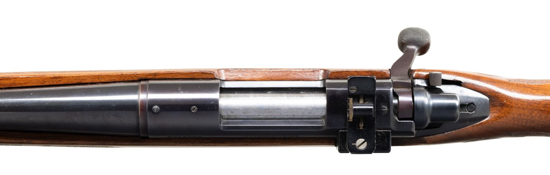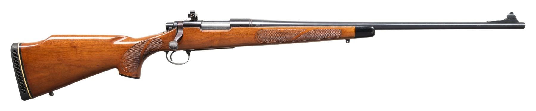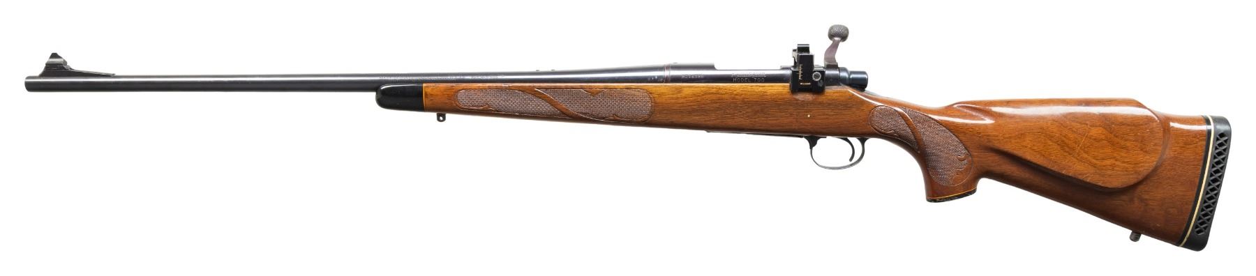 BOLT ACTION RIFLE. Cal. 350 Rem. Mag. S# 6214396. Bbl. 24". Model 700 BDL bolt action rifle mfg. by Remington. Left side of the bbl. is marked with Remington's mfg. and patent information, followed by the cal. designation. Left side of the receiver is marked with the S#, followed by the "Remington/ MODEL 700". Metal components exhibit a blue finish overall, save for on the bolt body, which is polished in-the-white. Aluminum trigger guard and hinged floorplate exhibit a dull black finish. 1-piece wood pistol grip stock featuring a black forearm tip and pistol grip cap, impress checkered panels with light foliate embellishments at the forearm and wrist, a right hand Monte Carlo cheek piece, as well as a ventilated Remington black rubber recoil pad. Lyman natural white beaded blade front sight, with Williams adj. aperture rear sight mounted on the left side of the receiver. Original rear sight is absent. Top of the receiver is factory drilled and tapped with 2 sets of plug screws. Bolt matches the receiver via the full S#, which is electro-penciled on the underside of the body. CONDITION: metal components retain the majority of their original factory blue finish, exhibiting some spots of light wear and thinning, as well as scattered spots of light surface oxidation overall. Very bright bore, exhibiting some scattered spots of light surface oxidation and pitting, while retaining strong rifling throughout. Proper manual mechanics. Stock shows scattered scratches and marks from handling and storage, but otherwise remains sound. PROVENANCE: Estate of Groves Herrick. (25-5706/MLW). CURIO. $400-600.