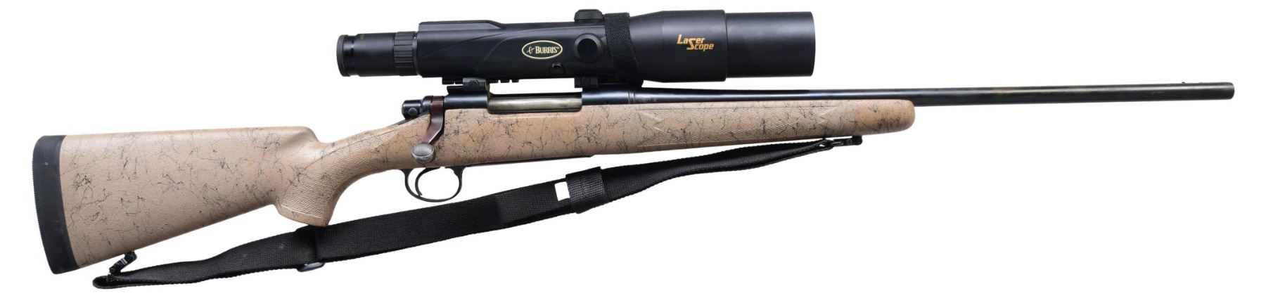 Cal. 270. S# B6861633. Bbl. 22" w/ sights removed. Burris Laser Scope Eliminator 4-12x w/ matte finish. 2 lug action w/ jeweled bolt body, 2 position safety & hinged floorplate. Bell & Carlson fiberthane stock w/ tan web finish & solid black pad. Remington sling on QD swivels. CONDITION: 90% blue. Bolt handle & body show finish wear. Stock shows very good finish. Very good bore. Scope has clear optics. (24-4240/DS). MODERN. $800-1,100.