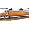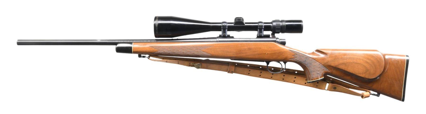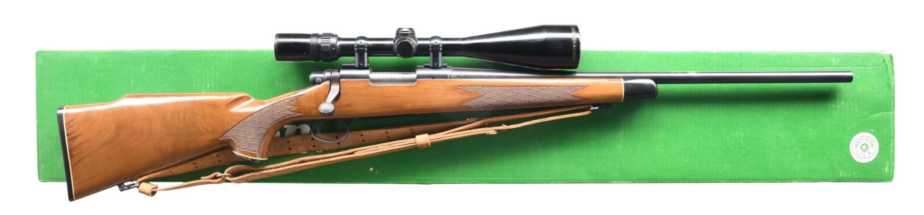 Cal. 7mm-08. S# C6361949. Bbl. 22" w/ sights removed. 2 lug action w/ jeweled bolt body. 2 position safety. Hinged floorplate. Bausch & Lomb 3-9x56 gloss finished scope w/ duplex reticle on Weaver type mounts. UNATTACHED ACCESSORIES: original box containing instruction packet & hang tag. CONDITION: 90% blue, bbl. has spots from gun rack wear. Stock shows scattered scratches w/ spots of gun rack wear. Very good bright bore. (24-4219/DS). MODERN. $700-1,000.