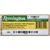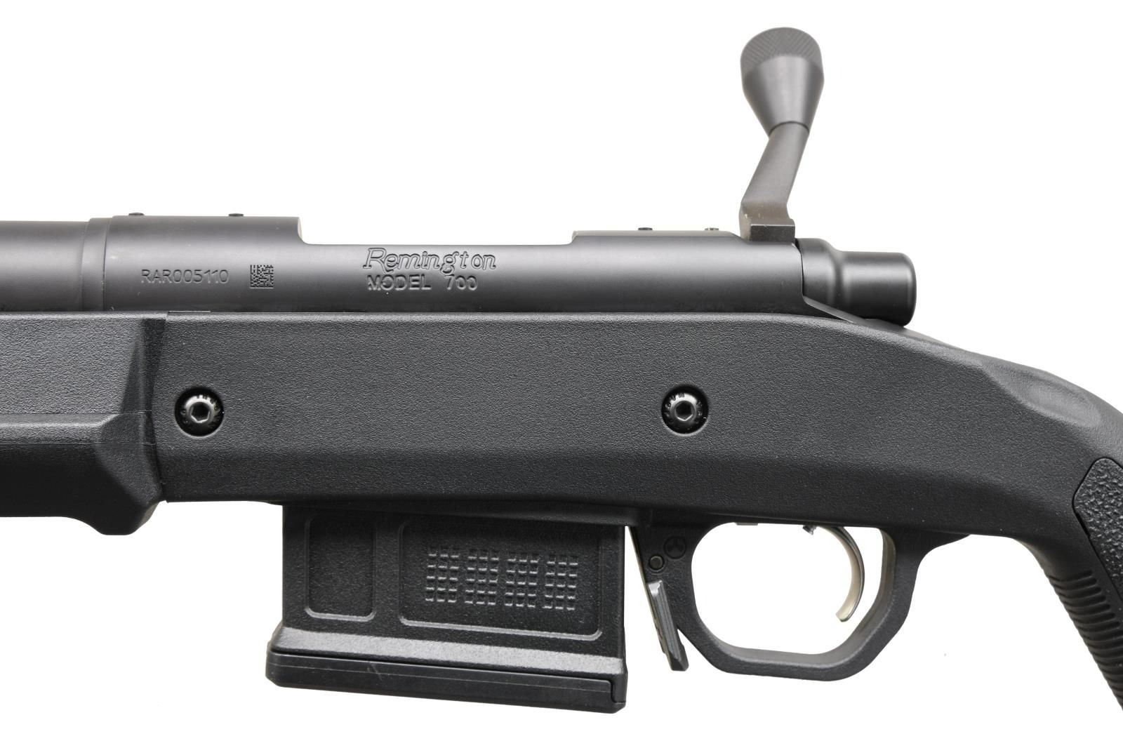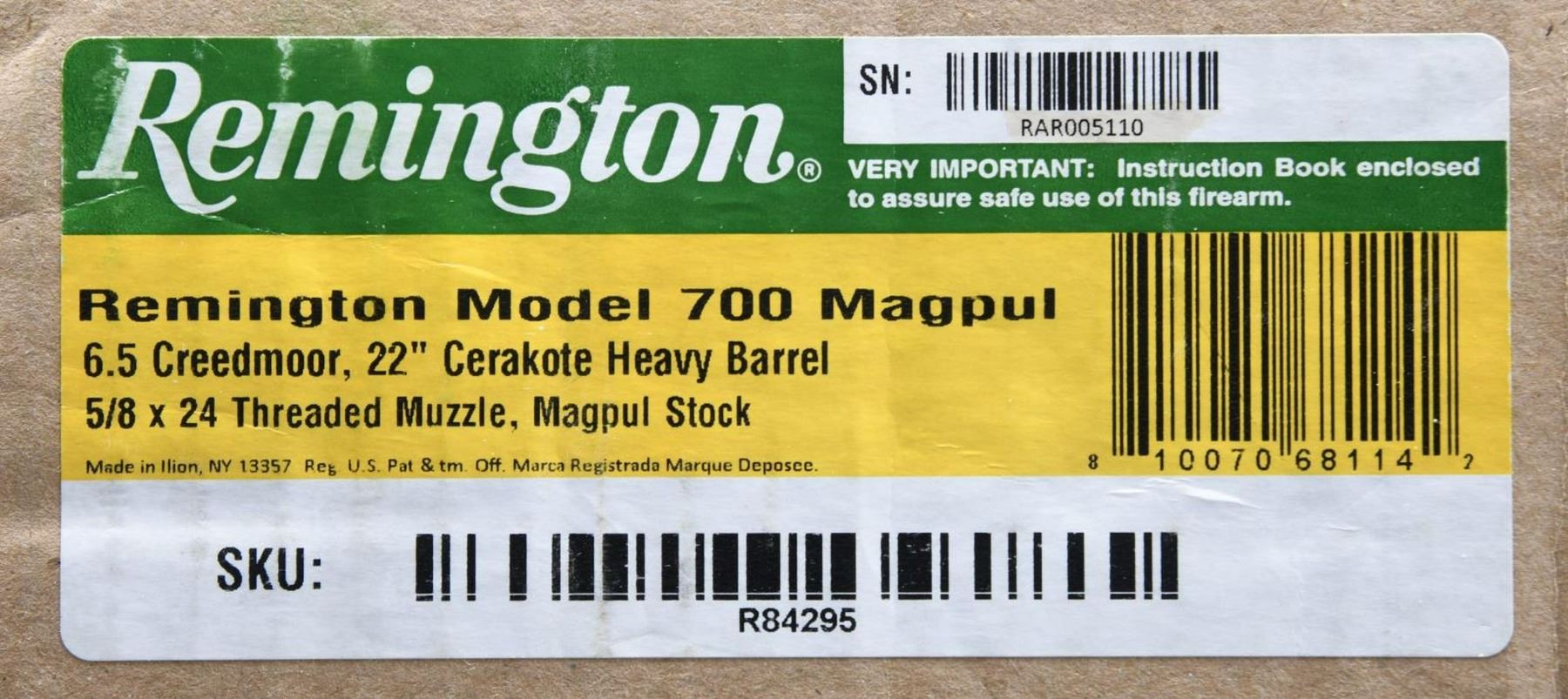 RIFLE WITH MATCHING FACTORY BOX. Cal. 6.5 Creedmoor. S# RAR005110. Bbl 22". Model 700 MAGPUL Hunter bolt action rifle mfg. by Remington. The left side of the bbl is marked with Remington's mfg. information, followed by the cal. designation, with the left side of the receiver being marked with the S#, followed by "Remington/ MODEL 700". Metal components exhibit a matte gray finish. 1 piece black polymer MAGPUL Hunter 700 stock. Receiver is factory drilled and tapped. Threaded muzzle with muzzle nut cap. MAGS: 1 5 rd. UNATTACHED ACCESSORIES: matching factory box. CONDITION: near new, with metal components retaining virtually all of their original factory finish overall. Mirror bore, exhibiting well defined rifling throughout. Polymer stock is excellent. Box shows some mild exterior wear, but otherwise remains sturdy and serviceable. PROVENANCE: The Collection of Gun Sport Ltd owned by Jon R. Thomas. (23-3472/MLW). MODERN. $800-1,200.