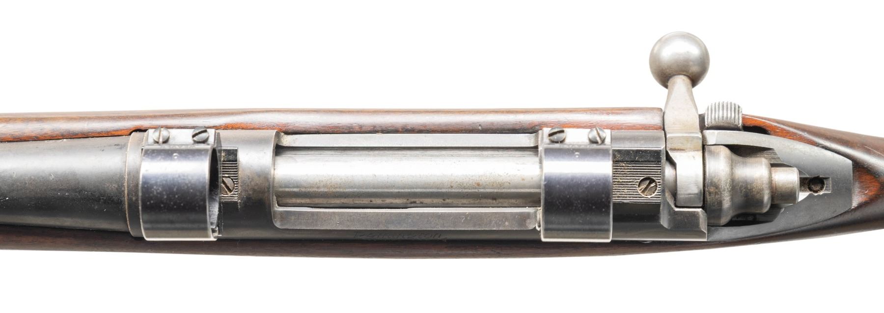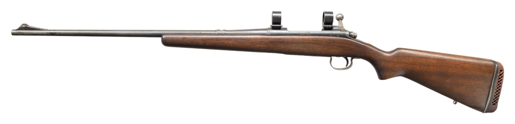 RIFLE. Cal. 30-06. S# 156950. Bbl. 24". Model 721 bolt action rifle mfg. by Remington circa. 1950. Left side of the bbl. is marked with Remington's mfg. information, followed by the cal. designation, with date code "W W" marked towards the breech. Left side of the receiver is marked with the S#, Remington trademark logo, and model designation. Metal components exhibit a blue finish overall, save for on the bolt body, handle, knob, and cocking piece, which are polished in-the-white. 1-piece plain wood pistol grip stock with added oversized Upland Game red rubber recoil pad. Toeline of stock is fitted with a sling swivel stud, with the forearm stud being absent. Ramped blade front sight (bead absent). Rear sight is absent. Receiver is factory drilled and tapped, featuring 2 Weaver 1" scope rings. CONDITION: metal components retain large amounts of their original factory blue finish, exhibiting wear and thinning fading to gray and brown patinas, with some light surface oxidation overall. Trigger guard and floorplate have been cleaned at one time, exhibiting a gray patina. Bright bore, exhibiting scattered spots and patches of light to mild pitting, while retaining strong rifling throughout. Proper manual mechanics. Stock shows scattered superficial marks and minor impressions from handling and storage, as well as a small circular plug repair on the underside of the forearm, but otherwise remains sound. (25-5309/MLW). CURIO. $250-400.