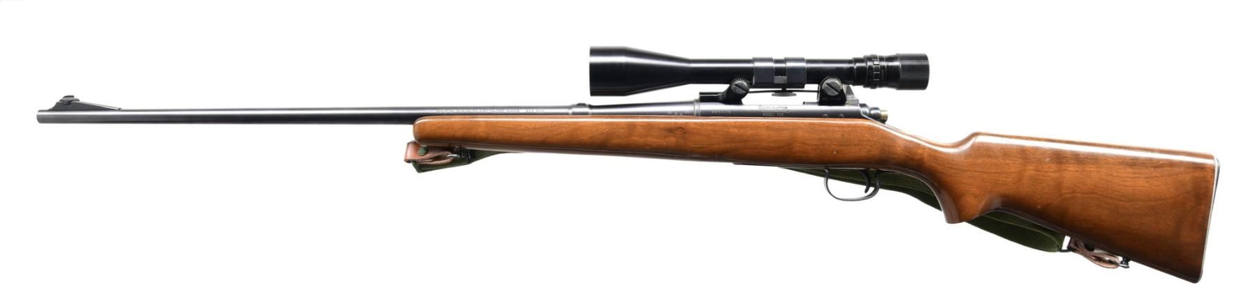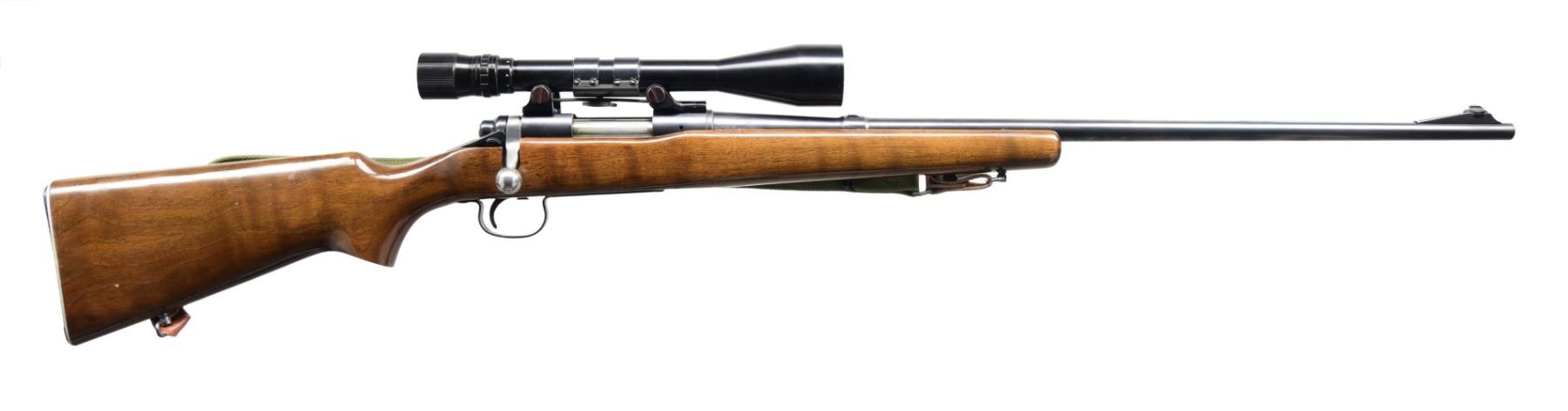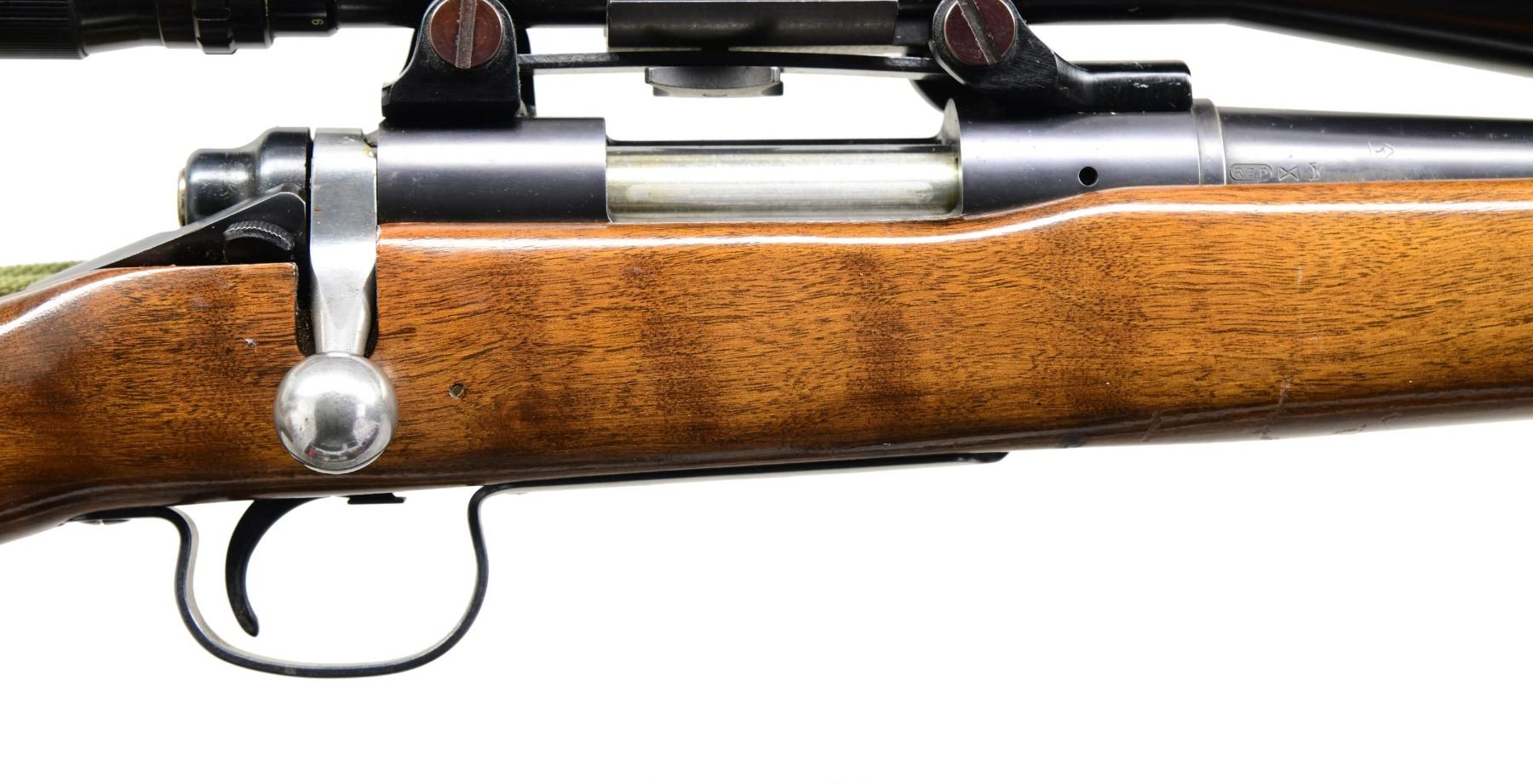 Cal. 222 Rem. S# 365179. Bbl. 26". Model 722 bolt action rifle mfg. by Remington Arms Co. Left side of the bbl . is marked with Remington's mfg. and patent information, followed by the cal. designation. Left side of the receiver is marked with the S#, followed by the Remington trademark logo and the model designation. Metal components exhibit a blue finish overall, save for the bolt (minus the bolt shroud), which is polished in-the-white. Plain wood pistol grip buttstock. Ramped aluminum beaded blade front sight. Rear sight has been replaced with a slot blank. Receiver is mounted with a Bausch & Lomb Balvar 8A scope. CONDITION: metal components retain bountiful amounts of their original factory blue finish, exhibiting a few light superficial handling marks as well as some scattered flecks of light surface oxidation overall. Mirror bore, exhibiting a couple scattered spots of pitting towards the muzzle while retaining well-defined rifling throughout. Stock exhibits scattered marks and minor impressions from handling and storage but otherwise remains sturdy and serviceable. Scope retains a clear and sharp optic. (24-3816/MLW). CURIO. $400-600.