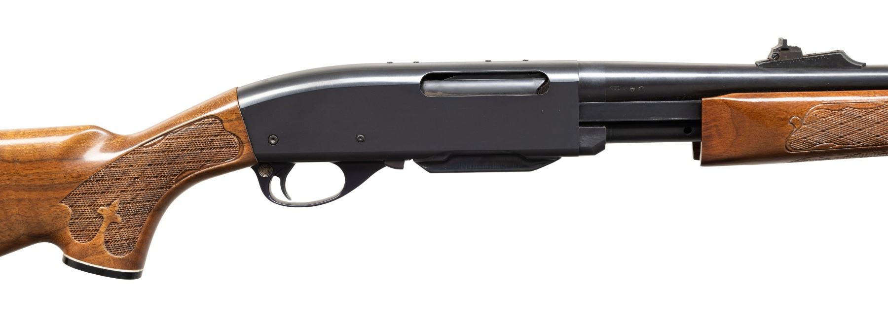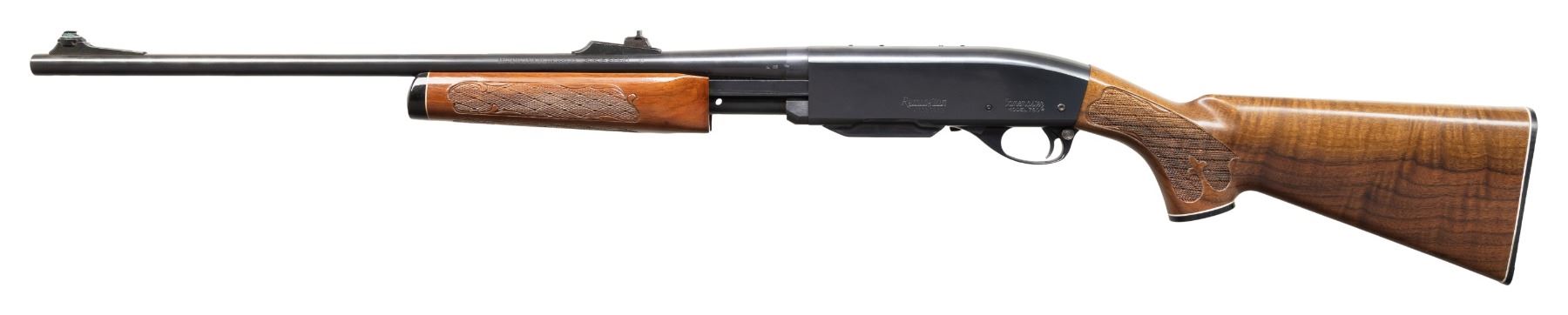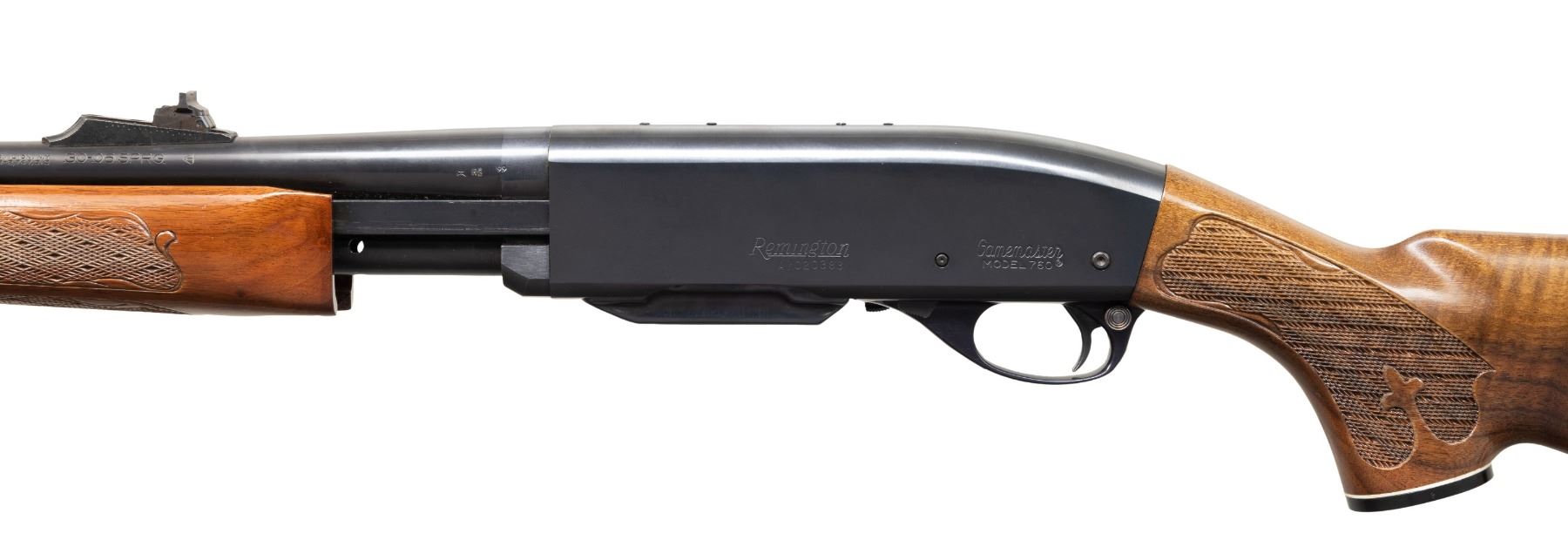 RIFLE. Cal. 30-06. S# A7020383. Bbl. 21 3/4". Model 760 "Gamemaster" slide action rifle mfg. by Remington. Left side of the bbl. is marked with Remington's mfg. and patent information, followed by the cal. designation. Left side of the receiver is marked with the Remington trademark logo above the S#, followed by "Gamemaster/ MODEL 760". Metal components exhibit a blue finish overall, save for on the aluminum trigger housing, which exhibits a black anodized finish. Impress checkered wood fleur-de-lis pump and pistol grip buttstock with black synthetic grip cap and checkered black synthetic Remington buttplate. Ramped brass beaded blade front sight with elevation adj. U-notch rear sight. Receiver is factory drilled and tapped with 2 sets of plug screws. MAGS: 1 blued steel 4-rd. CONDITION: metal components retain the vast majority of their original factory blue finish, exhibiting some superficial handling marks, as well as some scattered spots of light surface oxidation overall. Brilliant mirror bore, retaining well defined rifling throughout. Proper manual mechanics. Wood furniture is very good, showing some small superficial marks from handling and storage. PROVENANCE: Estate Collection of John "Jack" Dhooghe. (25-5552/MLW). MODERN. $400-800.