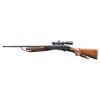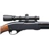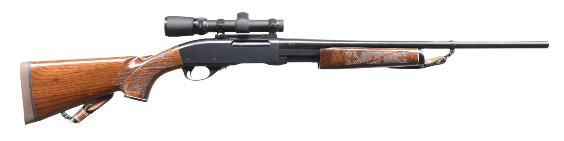 Cal. 35 Whelen. S# 8546926. Bbl. 22 1/2". Model 7600 pump action rifle mfg. by Remington. Left side of the bbl. is marked with Remington's mfg. information, followed by the cal. designation. Left side of receiver is marked with the Remington trademark logo above the S#, followed by "Model 7600". Receiver and bbl. exhibit a blue finish, with the aluminum trigger guard exhibiting a black anodized finish. Checkered wood fleur-de-lis pistol grip buttstock and pump. Front and rear iron sights are absent. Receiver is mounted with a Simmons Whitetail Classic 1.5-5x20 scope. Mag. is absent. CONDITION: excellent, with metal components retaining bountiful amounts of their original factory finishes, exhibiting some light wear on the mag. tube from cycling of the action, with few light superficial marks from handling and storage overall. Mirror bore, exhibiting well defined rifling throughout. Wood furniture is very good, showing a few minor marks and impressions from handling and storage. Scope retains a clear optic. (24-3439/MLW). MODERN. $1,200-1,800.