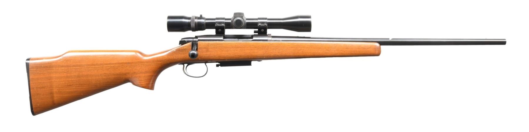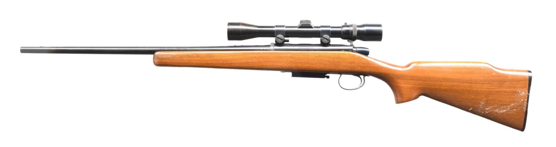 Cal. 30-30. S# 038472. Bbl. 21 1/2" w/ sights removed. Weaver V7-1 scope w/ standard crosshairs on Weaver mounts. Action features 3 rows of locking lugs. Monte Carlo walnut stock w/ original buttplate. The 30-30 cal. was discontinued in 1972. MAGS: 1 detachable. CONDITION: over 98% blue. Original stock finish shows scattered scratches & marks w/ an area showing debris from a spill on the left side near the butt. Very good bore. Scope has clear optics. (24-4247/DS). CURIO. $700-1,000.