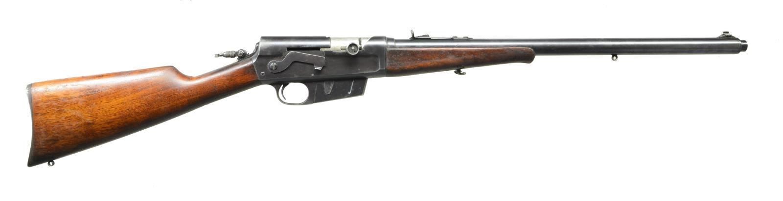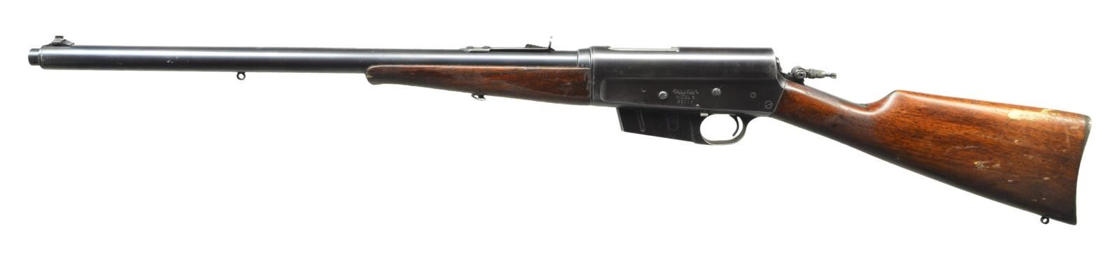 Cal. 35 Rem. S# 65714. The 22" bbl. w/ Remington marks on top is fitted w/ semi buckhorn rear & silver bead front sights. Typical blued action has Remington marks on left side & is fitted w/ Marble tang sight, specially made for this model. Stocks are of American walnut & are fitted w/ original steel buttplate we/ return on bottom holding sling eye matching that on bottom of bbl. Schnabled forend has sm. sling type mounting screw. CONDITION: fine. Metal parts retaining over 90% original blue. Stock w/ 85% original finish w/ some marks & losses. There is some paper remnants stuck to left side of butt. Bore is bright & shiny. Mechanically good. (22-1970/MGM). CURIO. $400-600.