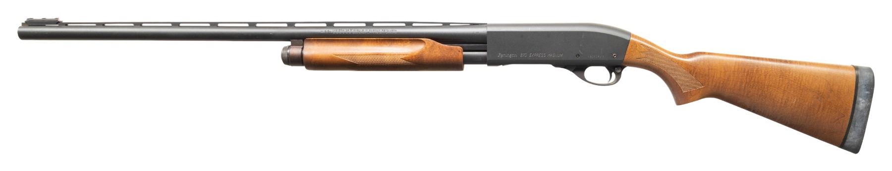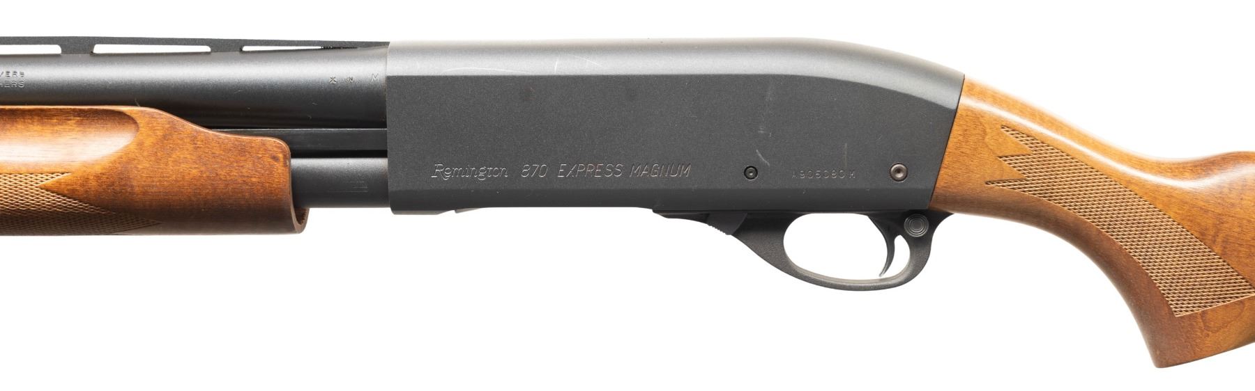 SHOTGUN. Cal. 12 GA, 2 3/4" or 3". S# A905080M. Bbl. 27 13/16". Model 870 Express Magnum pump action shotgun mfg. by Remington. Bbl. exhibits standard factory markings denoting the cal. designation, as well as Remington's mfg. information. Left side of the receiver is marked "Remington 870 EXPRESS MAGNUM", followed by the S#. Metal components exhibit a matte blue finish overall, save for on the aluminum trigger housing, which exhibits a matte black finish. Impress checkered wood pump and impress checkered pistol grip stock with Remington black rubber recoil pad. Bbl. features a threaded Remington Modified choke, V/R, aluminum bead front sight, and an added aftermarket red fiber optic front sight. CONDITION: metal components retain the vast majority of their original factory blue finish, exhibiting a few scattered superficial handling marks overall. Mirror bore, exhibiting a few streaks of hardened firing residue. Proper manual mechanics. Wood furniture is very good, showing some scattered superficial marks from handling and storage. (25-4806/MLW). MODERN. $300-500.