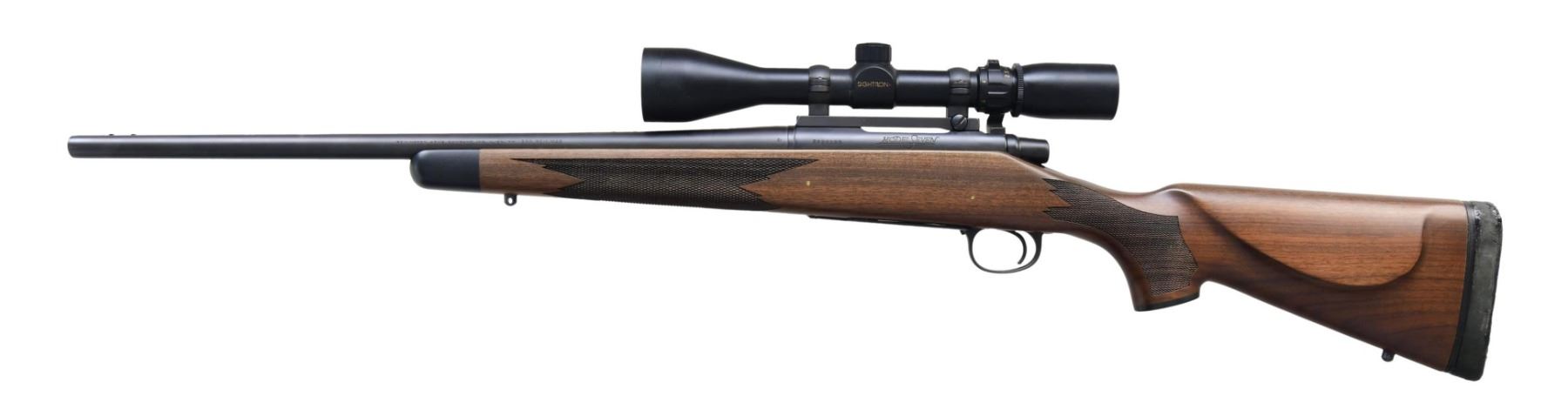 Cal. 350 Rem Mag. S# 7822155. Bbl. 22" w/ sights removed. Jeweled bolt body. Hinged floorplate. Matte black finish. Satin finished walnut cheekpiece stock. Features include cut checkering, black forearm tip & grip cap, swivel bases & R3 pad. Sightron 2.5-10x44 matte finished scope w/ duplex reticles on a 1 piece base. UNATTACHED ACCESSORIES: original box containing owner's manual, trigger lock & original sights. CONDITION: 98% wood & metal finish. Recoil pad has melted edges from apparent heat damage. Bright near excellent bore. (24-4255/DS). MODERN. $700-1,000.