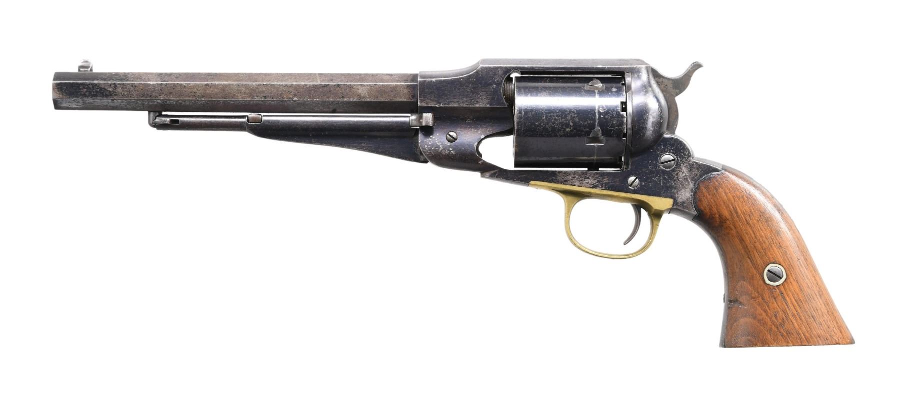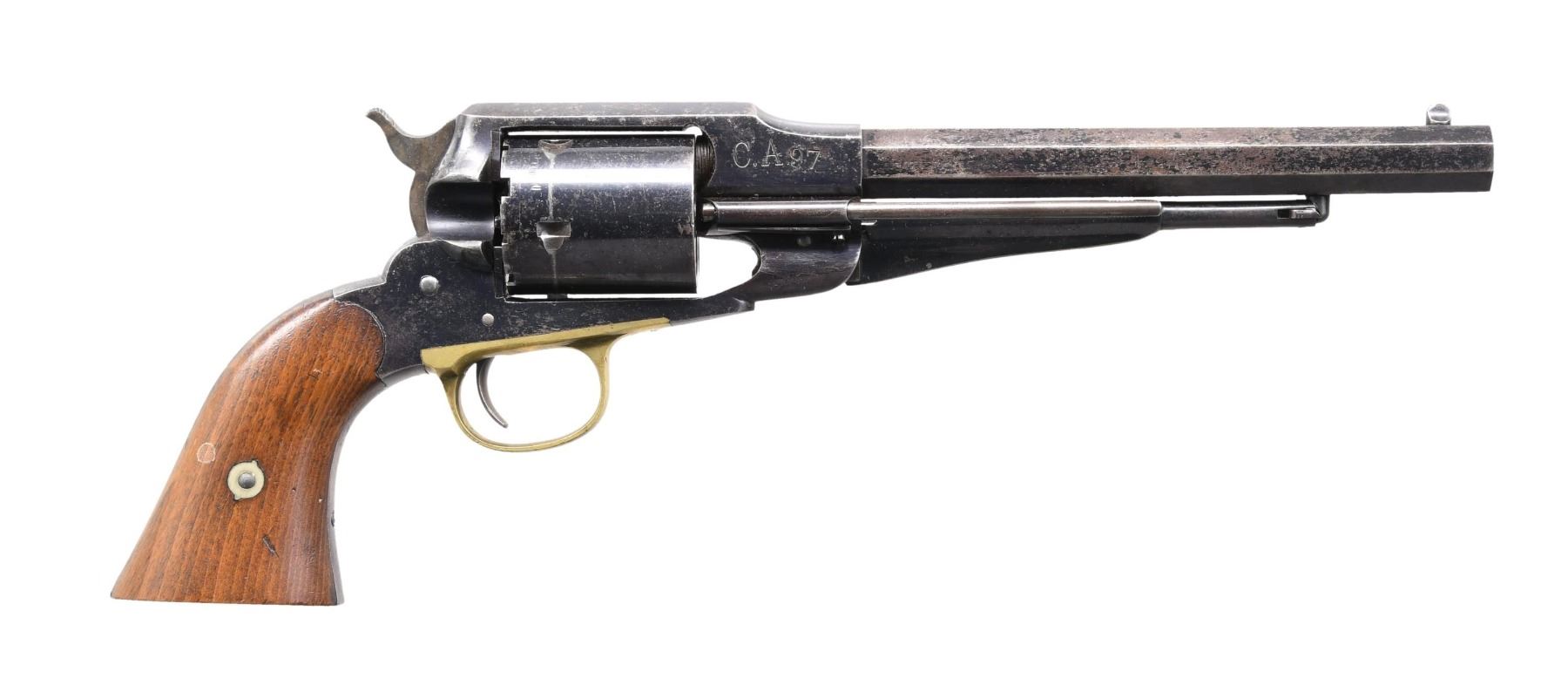 REVOLVER. Cal. 44 RF. SN. 91742. Bbl. 8" octagon w/ right side ejector. 6 shot conversion cyl. Right side front of frame is stamped "C.A.97". Blue finish w/ brass trigger guard. 2 piece walnut grips. CONDITION: metal retains 70% worn blue fading to gray. Refinished grips. good mechanics. Bore retains sound rifling. (01-25541/DS). ANTIQUE. $2000-2500.