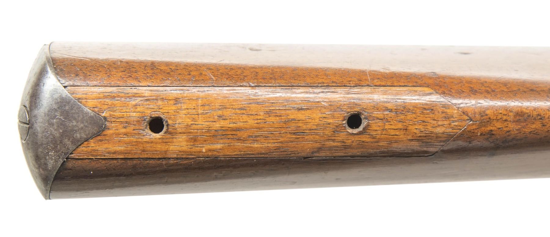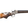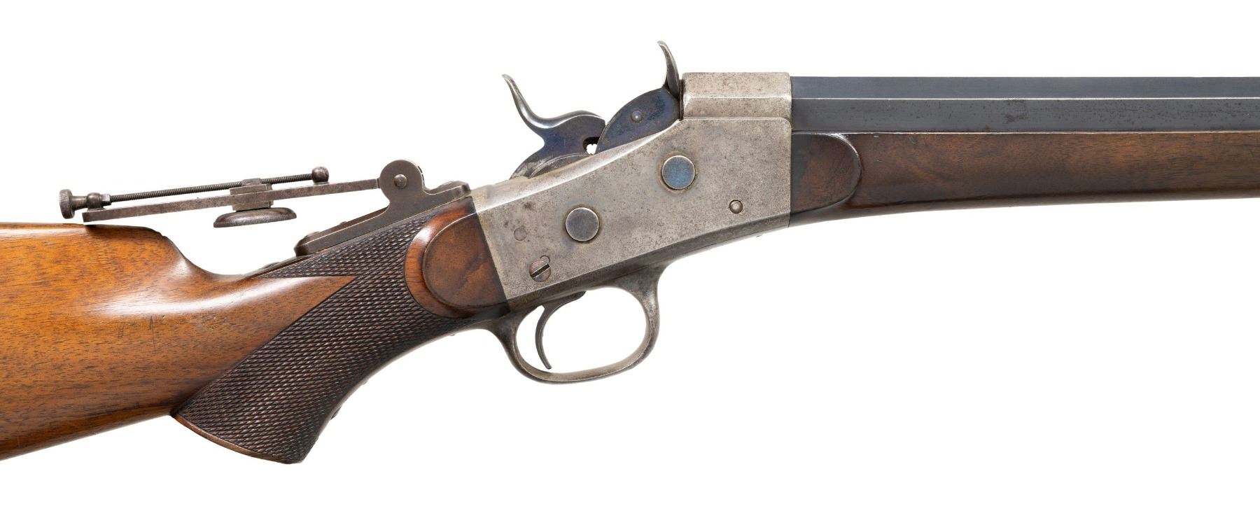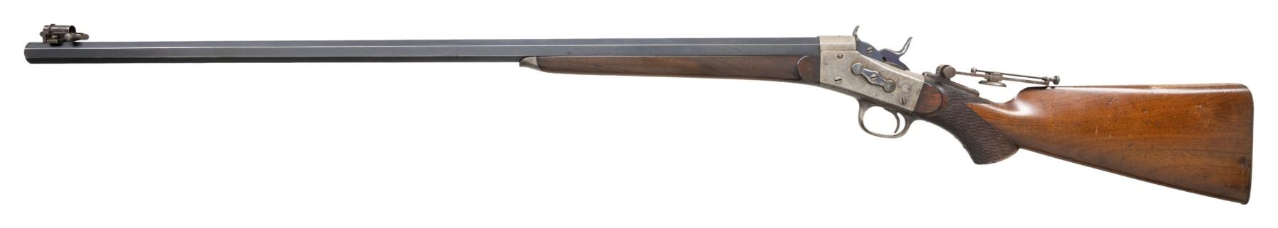 SINGLE SHOT RIFLE. Cal. 44-77. S#. 3334 found under forend. Bbl. 33" octagon measures 7/8" across flats at the muzzle. Bottom flat is marked "44 CTGE S". Globe front with Vernier tang sight. Blued bbl. with case colored action. Steel tipped forend and checkered pistol grip walnut stock with steel shotgun buttplate. Weight 9lbs. 9.8oz. Mfg., 1875-1890. CONDITION: barrel retains 70% lightly faded blue showing spotted light pitting. The action shows some light & faded case colors. Wood shows light wear & handling marks. The top of the comb has a 4" section of replacement wood with holes for sight attachment. Sound action. Bright bore retains sound rifling. PROVENANCE: The Esteemed Norm Greenberg Collection. (01-27755/DS). ANTIQUE. $1,500-2,500.
