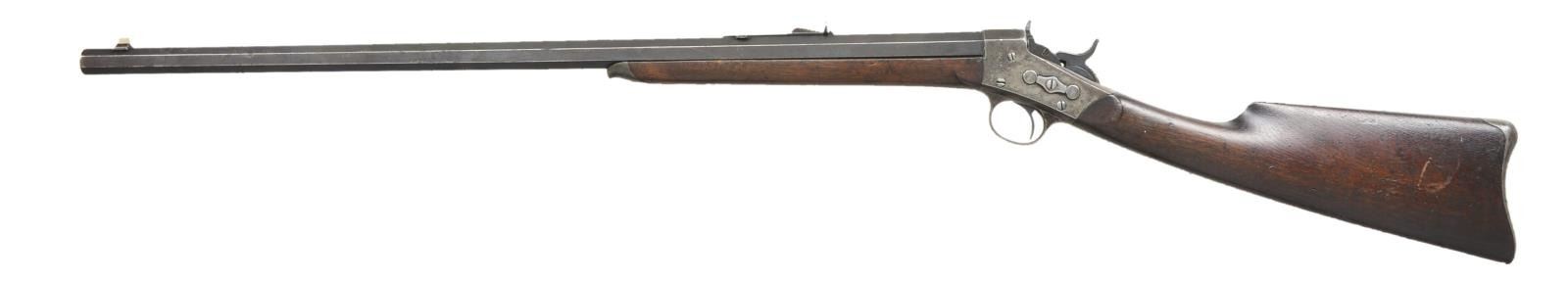 Cal. 22 LR. S# 7891. Bbl. 26" matching numbered (under forend) octagon with "22" on bottom flat in front of forend plus Remington marks on top flat at rear. Dovetailed sights of elevator adjustable rear plus brass blade in base at front. Mfg. 1873-1909; early examples had Remington info on tang and later production had Remington markings on frame like this one. Distinctive features of perch belly walnut stock set having cast contoured metal buttplate plus metal schnable tip on forend. Ends of small sized frame are curved rather than squared off like most Rolling Blocks plus stock set has slight panels at these junctures. Blued with case colored frame and buttplate. CONDITION: good general appearance with patina, peppery oxidation and handling marks throughout. All original metal finish with very faded grey case colors. Light screw slot marks on all screws. Light stock marks throughout and appearance of old added finish. Barrel has a very professional reline using a turned down barrel (or blank) rather than a low quality small diameter liner as is most often used. This superior method gives much better and more pronounced rifling. Further, the breech end of the liner was stepped so that the only evidence of relining at this point is a bright cartridge rim sized ring with the remainder of the breech area being original in appearance; not an easy task. The muzzle end shows a faint joining line of 5/8" diameter along with a lathe turned flat crown having proper outside edge bevel. A truly masterful (and costly) relining yielding a near excellent bore. PROVENANCE: Estate of Frank Glenn Marsh. (22-6175/NW). CURIO. $450-650.