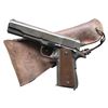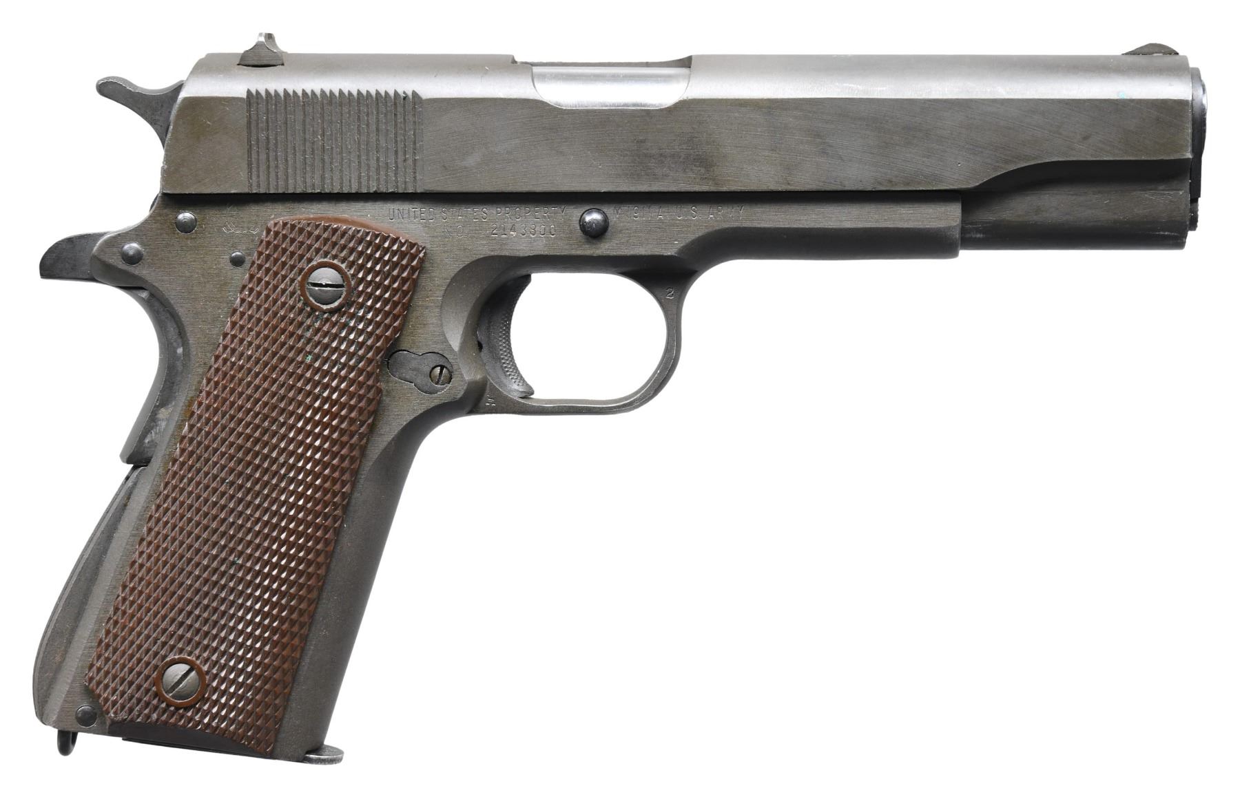 HOLSTER. Cal. 45 ACP. S# 2143800. Mfg. 1945 within S# range 2134404-2244803. Based on "U.S. Pistols & Revolvers 1909-1945" by J.C. Harrison, this pistol appears to have most correct era parts except for replacement unmarked 5" barrel & gunsmith replacement slide lock. MAGS: 1 Ridson 7 rd. made for Colt; mag. has over 85% finish with a couple spots of deep pitting & wear throughout. UNATTACHED ACCESSORIES: Boyt 42 dated US brown leather holster w/ leather thong. Holster intact with wear, scuffs & verdigris. CONDITION: slide & frame have very good over 85% original parkerized finish with light wear, scratches & spots of verdigris. Very good Keyes Fiber grips with light flattening of diamonds. Replacement barrel has very good finish & bore showing strong rifling. Gunsmith part has reblue style finish. (25-3640/MD). CURIO. $1,000-1,500.