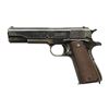 Cal. 45 ACP. S# 1329652 (1943). Correct features include High Standard 5" Type 18 bbl., Type C front sight, Type C rear sight, Type 10 Keyes Fiber drab brown stocks, Type C slide lock, Type C magazine release lock, Type C safety lock tab, Type E variation 2 hammer, Type 5 mainspring housing, type 2 mainspring housing pin, Type 2 recoil spring plug, long tang grip safety, & short checkered trigger. Frame has "FJA" & "P" proofs on left side. MAGS: 1 Risdon 7 rd. mag. Good finish showing wear & peppery oxidation. CONDITION: Frame & slide have arsenal type refinish showing blue mixed w/ brown patina & prior pitting. Bbl. has green parkerized refinish. Sm. parts show blue refinish. Very good grips w/ some flattened checkering. Very good bore. (23-2582/MD). CURIO. $800-1200.
