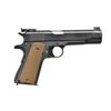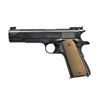 Cal. 45 ACP. S# 1433789. Bbl. 5" without any markings; standard throating. Mfg. 1943 with "FJA", ordnance wheel, flaming bomb (right side by finger recess) and "P" proofs. Fully checkered walnut grips; originals were brown plastic by Keyes Fibre. Right side above trigger has "R.I.A." and "FK" (Frank Krack; RIA inspector from Sept 1941 to July 1946). Long steel trigger (great target quality trigger pull) from Model 1911 having marks of prior shoe installation. "G" frame inspector mark plus "3" and "Y" on trigger guard. Late in the year features of grooved arched mainspring housing, safety tab without under cut and serrated slide lock. Slight work to resemble post war made up National Match pistol as used at Camp Perry. Tall (.260") square faced undercut front sight and BO-MAR rear sight in standard dovetail. Rear of frame rails have punch marks on sides rather than top to tighten the fame to slide fit yet it's about normal. MAGS: 1 good to very good Scovill 7 rd. having deep swedged pins. CONDITION: good to very good appearance as refinished; slide with more gloss than frame. All markings clear except ordnance wheel. Heat discoloration on front of slide in sight area. Slight thinning of finish in grip area. Typical scratch from improper slide lock installation. Bent lanyard loop. Very good grips. Exterior of barrel with noticeable function wear. Near excellent bore. (22-6370/NW). CURIO. $500-750.