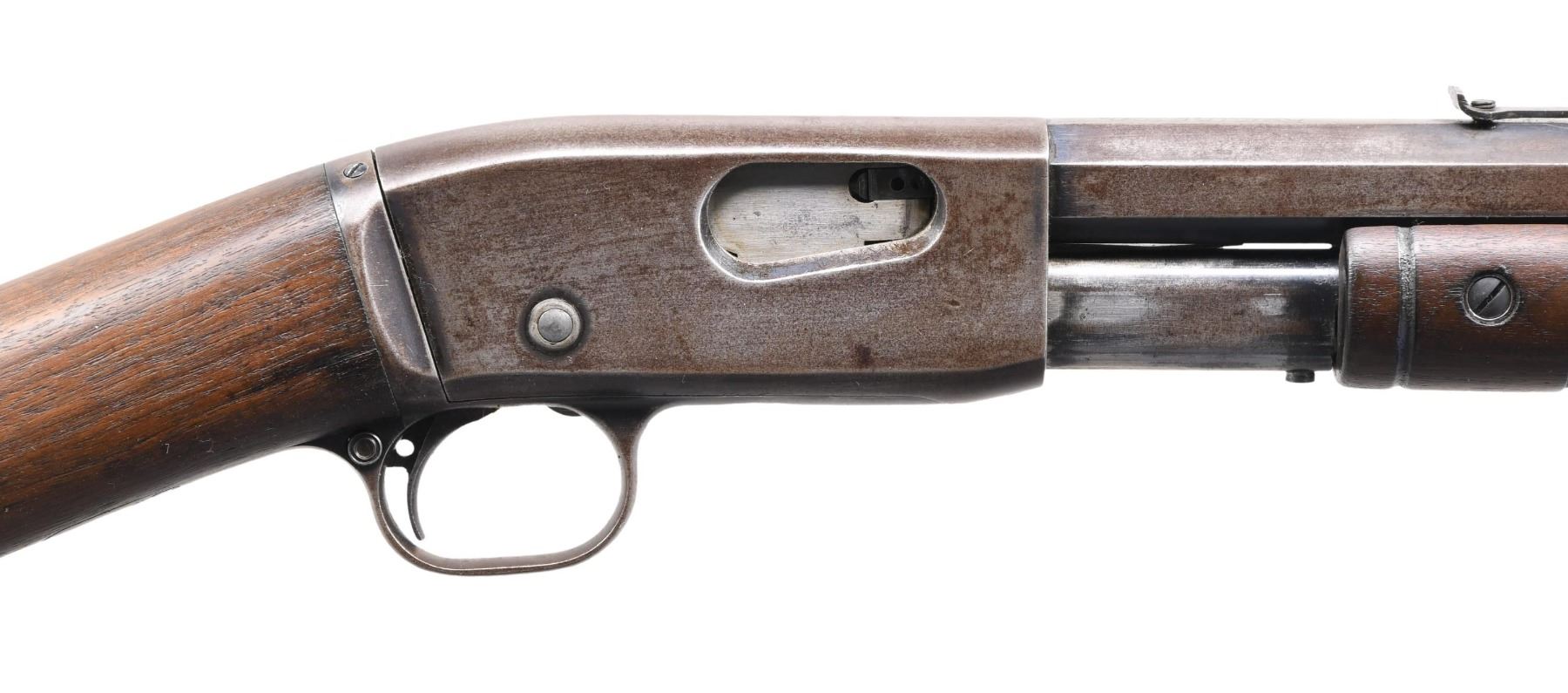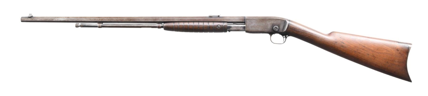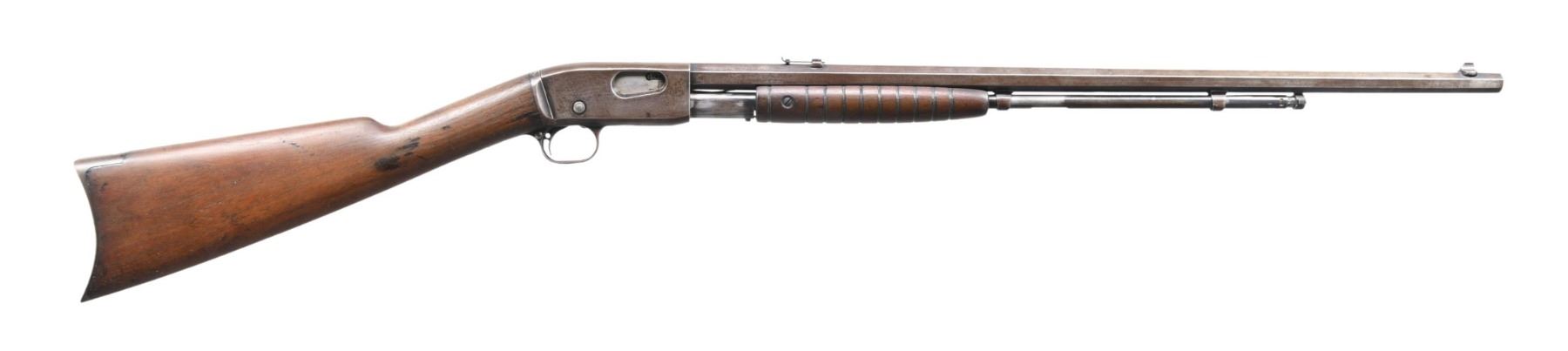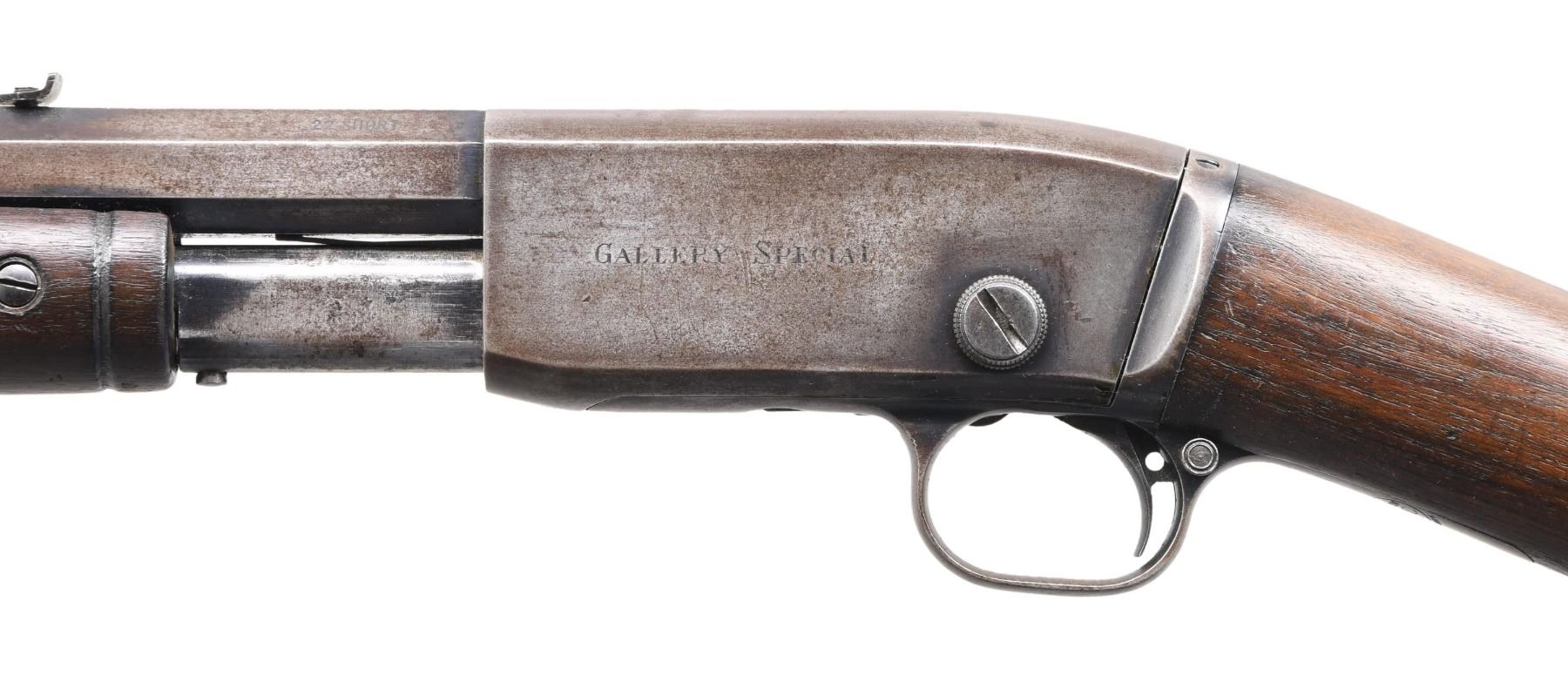 RIFLE. Cal. 22 Short. S# 35. Bbl. 24" octagon. Replacement bead front sight w/ original sporting rear sight. 15 rd tubular mag. Blue finish. Left side of receiver is marked "GALLERY SPECIAL". Grooved forearm & scarce straight grip walnut stock w/ crescent steel buttplate. CONDITION: metal has faded to a gray-brown patina. Wood has dark worn appearance showing numerous scratches, marks & small dents. Front sight has broken bead. Lightly pitted bore w/ worn rifling. PROVENANCE: The estate collection of Don "Duck" Combs. (24-2428/DS). CURIO. $1,000-1,500.