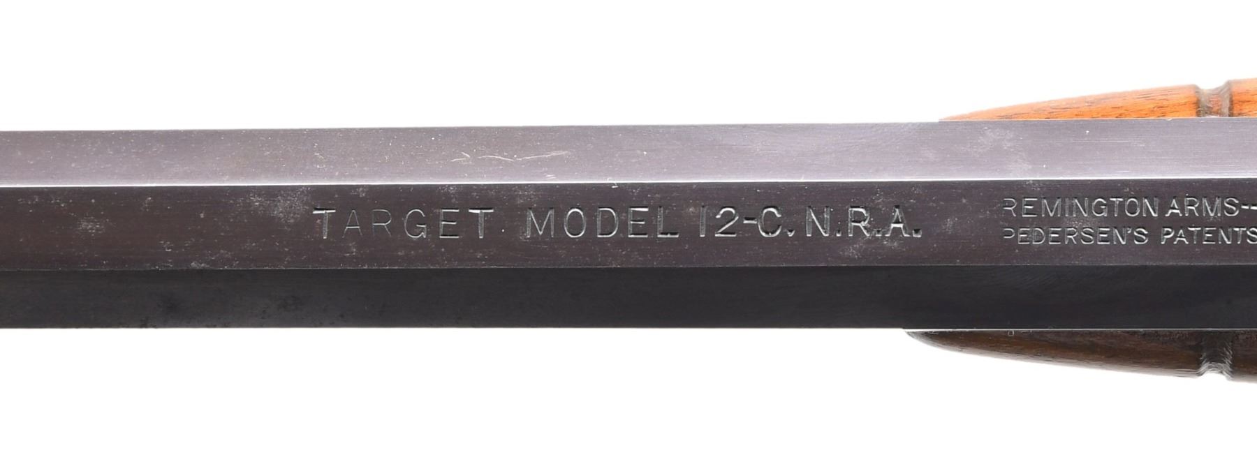 Cal. 22 S,L,LR. S# 482592. Bbl. 24" octagon. Adj. globe front sight & large aperture Lyman tang sight. Blue finish. Rear mag. band has a sling eye w/ leather sling held by an original sling hook. Grooved round forearm & pistol grip walnut stock w/ crescent steel buttplate. Stock has no sling eye provision. Limited mfg. beginning in 1917 for NRA smallbore rifle matches. CONDITION: fine, retaining over 95% blue showing small spots of freckling. Stock has lightly worn finish w/ scattered scratches & marks. Forearm is chipped at bottom of rear edge. Good bore w/ lightly worn rifling. PROVENANCE: The estate collection of Don "Duck" Combs. (24-2427/DS). CURIO. $1,500-2,000.