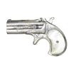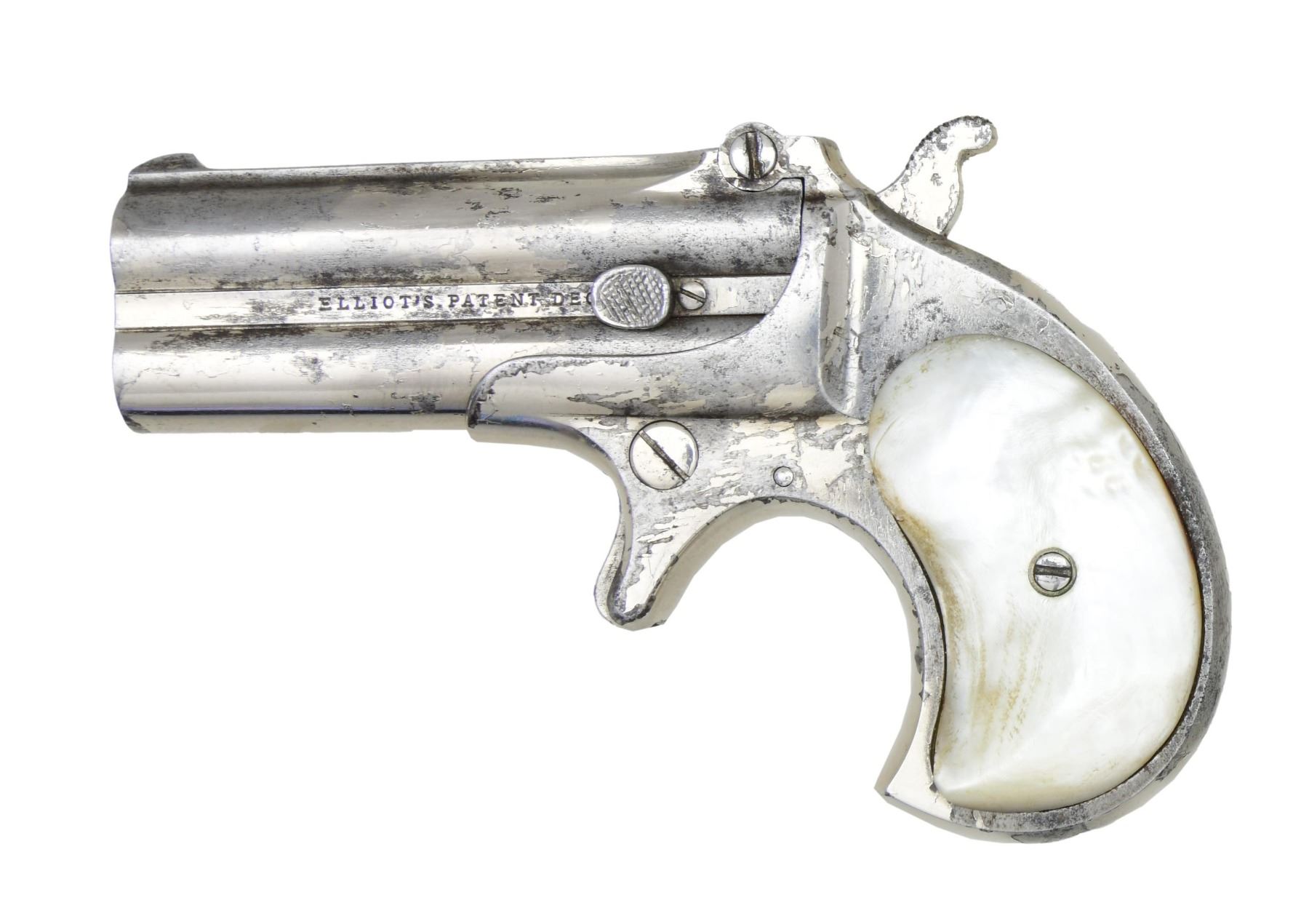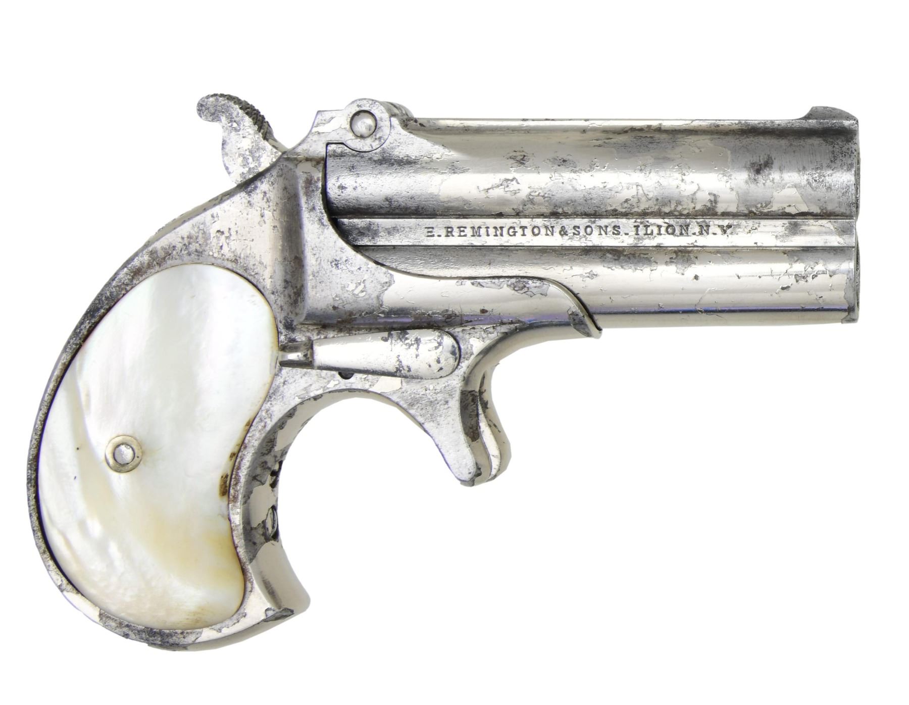 Cal. 41 RF. S# 1986. Bbls. 3" round w/ rib & extractor. Center ribs are marked "E. REMINGTON & SONS, ILION , N.Y." on one side. Other side is marked "ELLIOT'S PATENT DEC", rest of marking is cut-off by extractor slot. Spur trigger action w/ center mounted hammer. Nickel finish. 2 piece pearl grips. Mfg. 1867-68. CONDITION: 30% nickel showing spotted corrosion & light pitting. Good grips. Sound mechanics. Dark pitted bores. (01-25930/DS). ANTIQUE. $800-1,200.