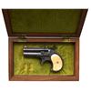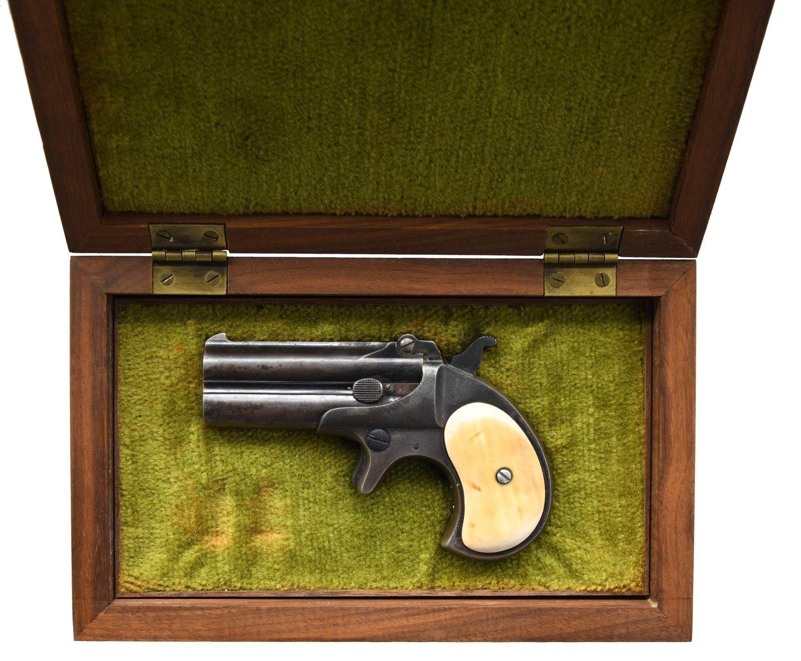 CASE. Cal. 41 RF. S# 52 (beneath the left grip panel). Bbl. 3". Model 95 O/U derringer pistol mfg. by Remington UMC. The top of the bbl. rib is marked "REMINGTON ARMS - U.M.C. CO. ILION, N.Y.". Metal components exhibit a blue finish, with the frame being mounted with 2-piece ivory grips. Grip screw is a contemporary replacement. UNATTACHED ACCESSORIES: contemporary wood display case featuring a green fabric lining. CONDITION: metal components retain traces of their original factory blue finish, exhibiting wear and thinning that shows through to a gray patina, with light to mild pitting present overall. Bores are bright, exhibiting scattered spots of mild to moderate pitting and retain good rifling throughout. Ivory grips exhibit some scattered marks from handling and storage, but otherwise remains sturdy and serviceable. Case is very good to excellent overall. (23-6107/MLW). CURIO. $300-450.