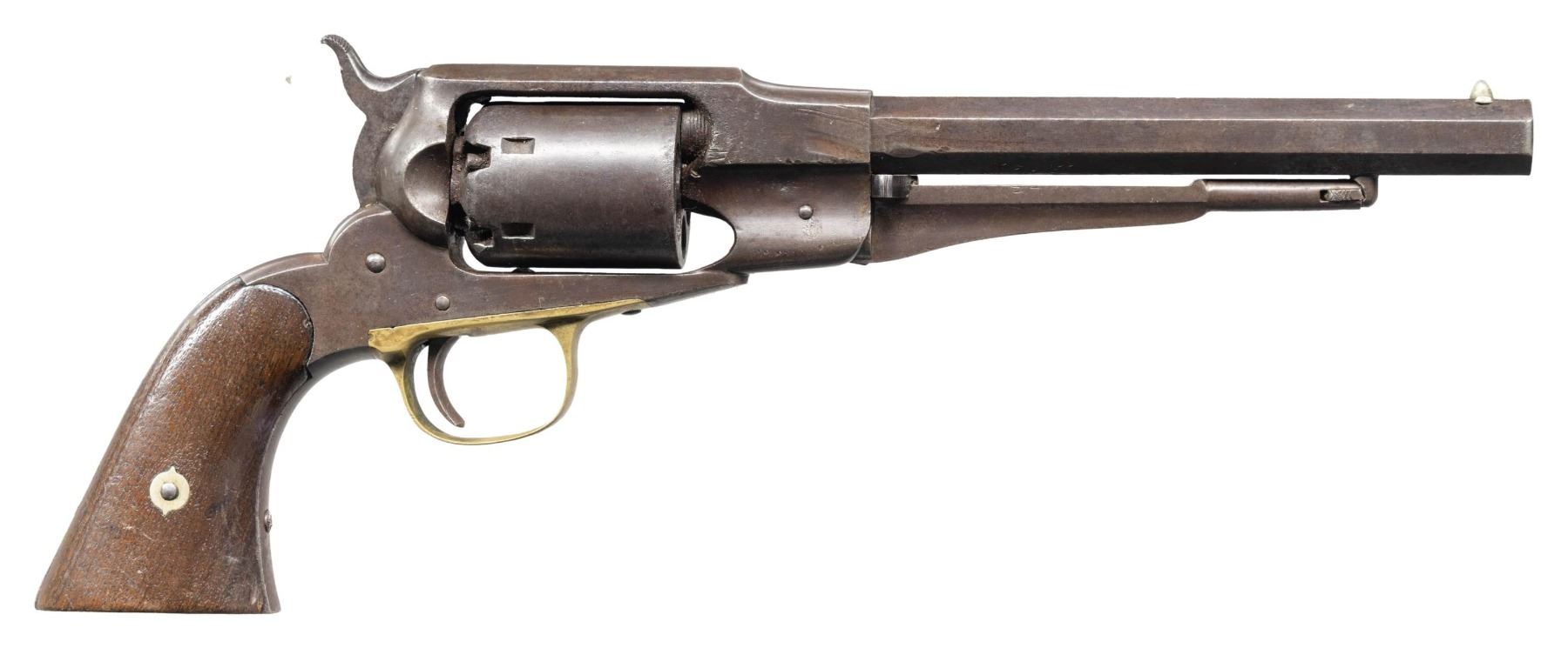 Cal. 36. S# 18180. Bbl is 7 3/8" oct with large bead sight. 2-line address has patent date of Dec. 17, 1861. 6-shot round cyl. Brass trigger guard. Various parts have inspector initials "C" or "P". 2-pc walnut grips; left panel has illegible remnants of cartouche. Estimated quantity of 7,000 mfg in 1862. CONDITION: metal has faded to brown showing dents and marks. Grips show heavy wear with chips at toe. Functioning action. Lightly pitted bore retains strong rifling. (01-28540/DS). ANTIQUE. $1,500-2,000.