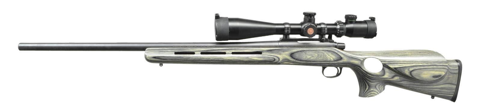 SHOT TARGET RIFLE. Cal. 204 Ruger. S# 7810314. Bbl. 26", target weight. Action features jeweled bolt body, matte black metal finish. Gray/green laminated Monte Carlo cheekpiece thumbhole stock w/ forearm vents, swivel bases & thin black pad. Osprey 6-24 50mm matte finish scope w/ 30mm tube, target turrets, ao & range finding reticle on Leupold mounts. UNATTACHED ACCESSORIES: original box containing owner's manual, safety act notice, Virginia firearms law summary, retailer tag & trigger lock. CONDITION: near new, appears unused. Scope has bright optics. (22-1023/DS). MODERN. $1,200-1,600.
