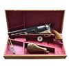 Cal. 44. S# 1220. Bbl. 9". Brass blade front sight. Blued bbl. & cyl. Cyl. has engraved western scenes. Case colored frame, loading lever & hammer. Brass trigger guard. Walnut grips. UNATTACHED ACCESSORIES: velvet lined hardwood display case that shows several cracks on its exterior with powder flask & bullet mould. CONDITION: grips have added varnish with a small crack at top of right panel, some scratches, handling marks & light dings. Trigger guard shows some scattered tarnishing & light dings. Case colored parts retain strong amounts of case colors with scattered fading to gray & oxidation. Blued parts retain 93% finish with scattered dings, operational & edge wear. Action is sluggish but functional when hand cycled. Bore shows scattered oxidation & some pitting but evident rifling. (01-26052/MJC). ANTIQUE. $300-500.