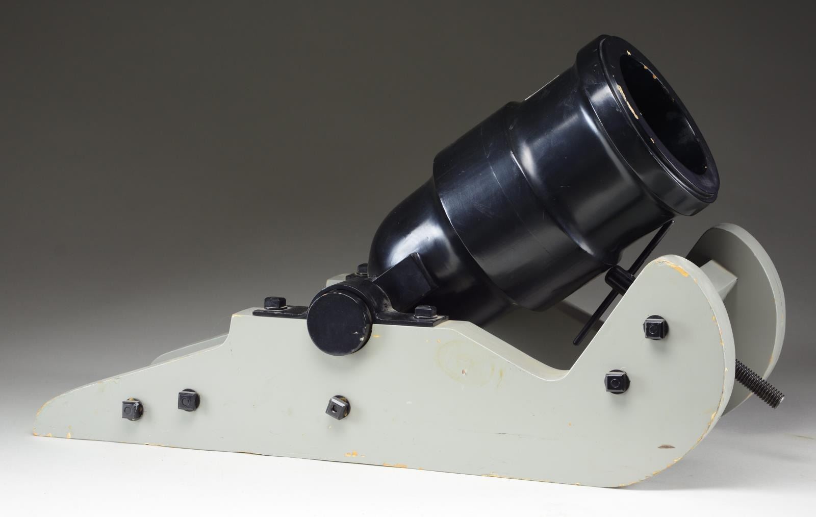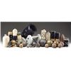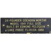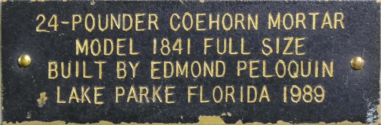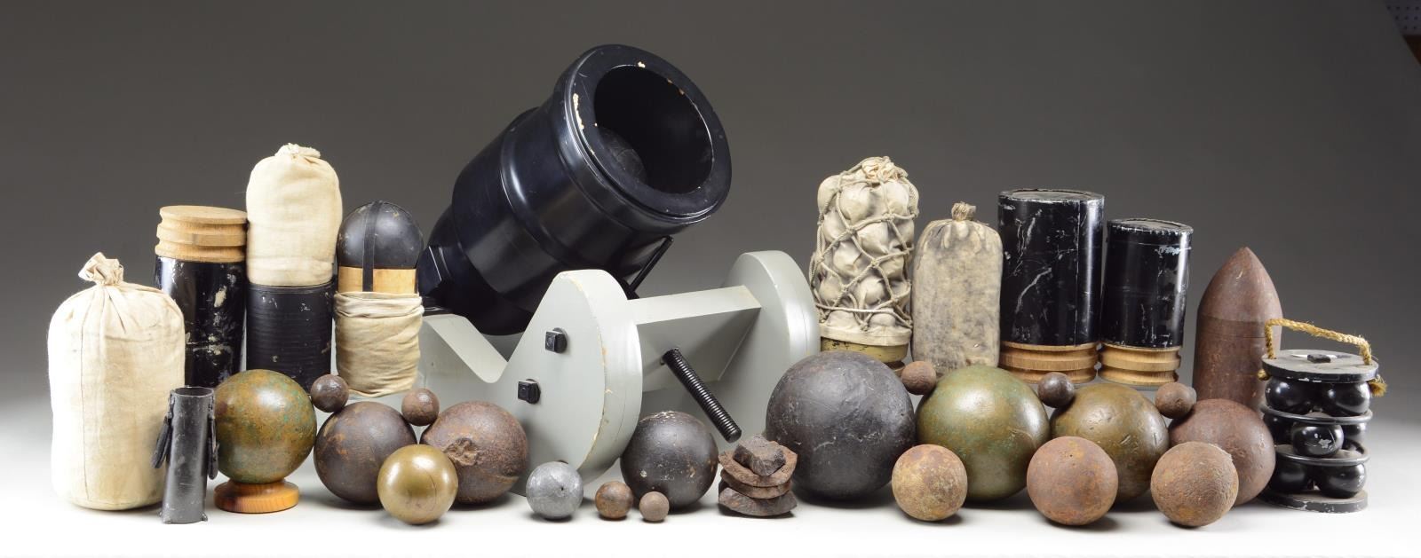 This lot consists of 1 brass cannonball weighing 2.19 lbs. & measuring 3" in diameter. / 1 Brass cannonball weighing 7.3 lbs. & measuring 4.25" in diameter. / 1 Brass cannonball weighing 10 lbs. & measuring 5.5" in diameter. / 1 Brass cannonball weighing 8 lbs. & measuring 5" in diameter. / 7 Small "grape" shots, each weighing 0.4 lbs. & measuring approx. 1.5" in diameter. / 1 Cannonball weighing 7.8 lbs. & measuring 3.75" in diameter. / 1 Cannonball weighing 12.5 lbs. & measuring 4.5" in diameter. / 1 Cannonball weighing 5.3 lbs. & measuring 3.25" in diameter. / 1 Cannonball weighing 4 lbs. & measuring 3" in diameter. / 1 Cannonball weighing 10 lbs. & measuring 4.25" in diameter. / 1 Cannonball weighing 6 lbs. & measuring 3.5" in diameter. / 1 Cannonball weighing 2.2 lbs. & measuring 2.25" in diameter. / 2 "Grape shots"; one of which is made of cast iron & the other appearing to be made of wood. / 3 Replica canisters. / 4 Replica wads. / 1 Iron, parrot style shell measuring 10.5" long x 3.5" in diameter & weighing 23 lbs. / 1 Full-size replica M1841 Coehorn Mortar weighing 24 lbs. & measures approx. 31" x 18" x 13". Built by Edmon Peloquin of Lake Parke, Florida in 1989. Comes with 2 replica 6" cannonballs. Also included in this lot are fragments of shots. CONDITION: the Coehorn is good but appears to show cracks around nuts & on mount with some chipping on edge finish. Cannonballs & cannisters appear in good condition, showing some wear with oxidation on metal & verdigris on brass. PROVENANCE: from the Lifelong Collection of Glen E. Mattox. (02-18738/MD). $500-1000.