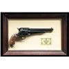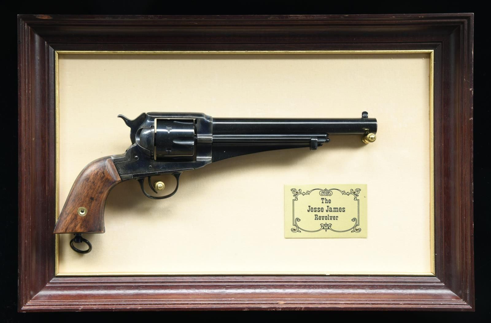 NSN. Bbl. 7 1/2" plugged. Non firing replica of an 1875 Remington SA revolver. Case colored frame. Blued bbl., cyl., trigger guard & ejector rod. Hammer cocks, cyl. cycles & loading gate opens. Hardwood grips. UNATTACHED ACCESSORIES: display frame marked "The Jesse James Revolver". CONDITION: grips show light handling wear. Metal shows some scattered moderate flaking. (02-20990/MJC). NON-GUN. $100-200.