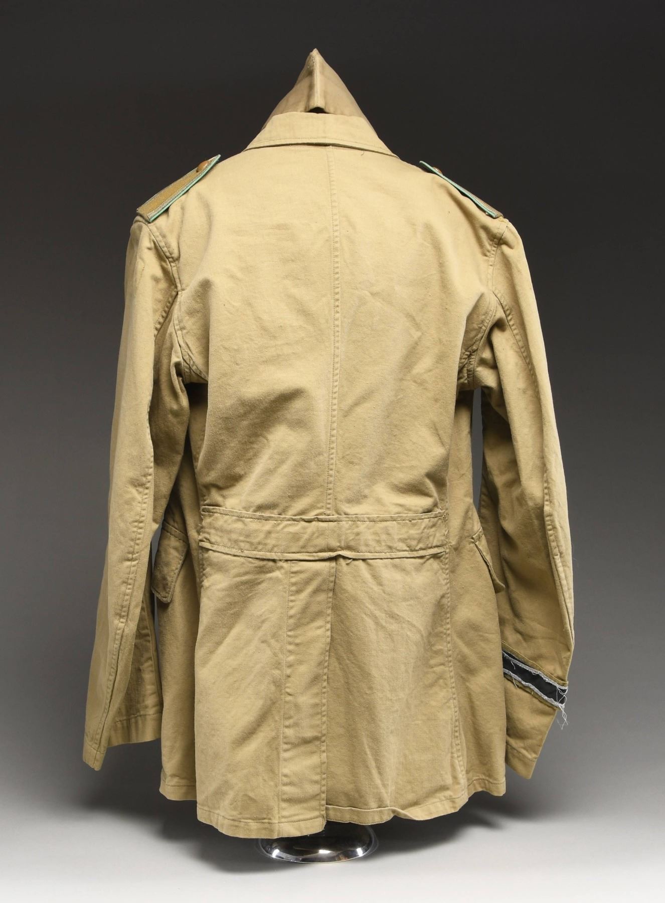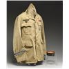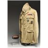 A good quality home made reproduction Afrika Korps tan tunic with the shoulder boards of a Lance Sergeant. The tunic has 3 ribbons, Infantry Assault Badge and Black Wound Badge. The right cuff has a reproduction "AFRIKA KORPS" cuff title. The interior German markings are done with a Sharpie. Belt is a non-military civilian model and hat is of US issue with added WWII German insignia. CONDITION: uniform generally shows light wear. (02-24496/BF). $100-200.