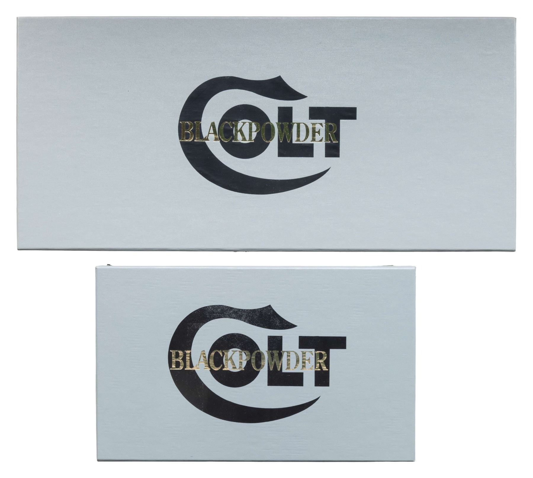 REVOLVER. Cal. 44. S# 6773. Standard configuration in wood casing, 9" octagonal to round barrel, right side marked "US / 1847", gold plated powder flask, blued bullet mold & combination tool, loose balls, cap tin. UNATTACHED ACCESSORIES: shipping boxes for Colt decorated revolver & accessory boxes. CONDITION: like new with the original boxes for gun & accessories. Revolver retains most all bright blue and case colored finish. Mechanically crisp, bright shiny rifled bore. Accessories are also like new with high finish. Compartmented case is branded with COLT logo. (01-28706/JS). ANTIQUE. $600-800.